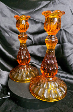 Vintage Amber Glass Candlestick Duo – Warm Honey Glow, Tulip Rim Elegance