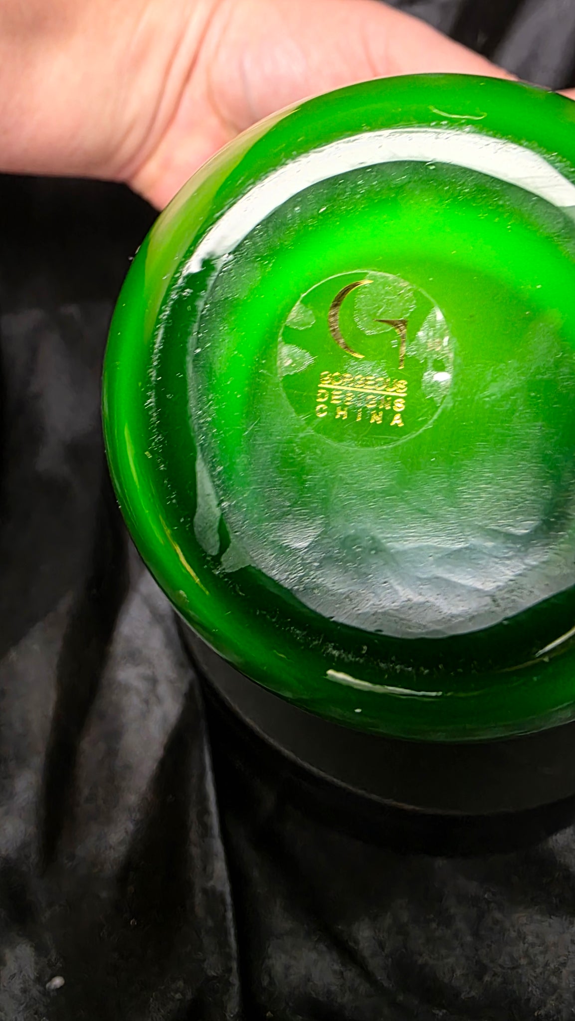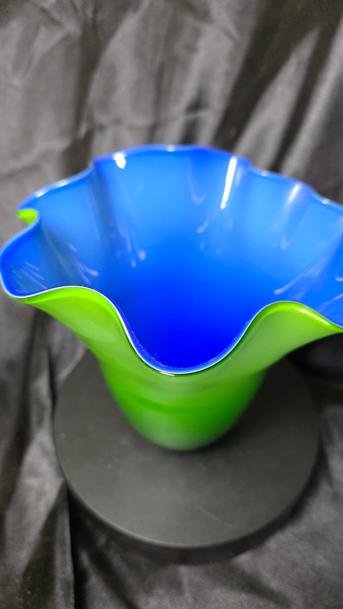 A bold expression of movement and color, this handblown Fazzoletto-style vase captures the sculptural elegance of the iconic “handkerchief” form. The ruffled, undulating rim rises and falls in fluid waves, creating a dynamic silhouette that feels both organic and architectural. Its vibrant emerald green exterior contrasts beautifully with a rich cobalt blue interior, producing a luminous cased-glass effect that glows from every angle.