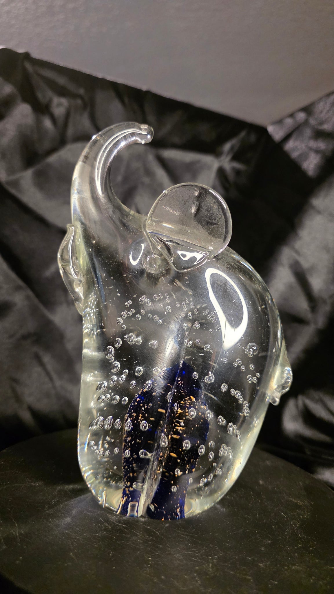 Bring a touch of timeless elegance and good fortune to your space with this stunning vintage Italian Murano art glass elephant paperweight. This exquisite piece showcases the renowned bullicante technique, a signature of master glassmakers from the island of Murano, Venice, Italy. The controlled, evenly spaced bubbles suspended within the clear, heavy glass create a mesmerizing, three-dimensional effect that captures and reflects light beautifully. Integrated within the solid glass body is a striking blue core, adding a vibrant splash of color and unique visual depth to this decorative elephant sculpture.