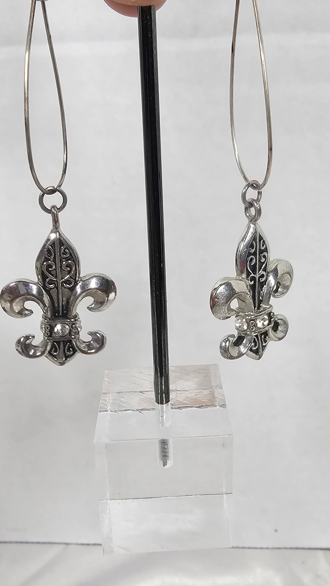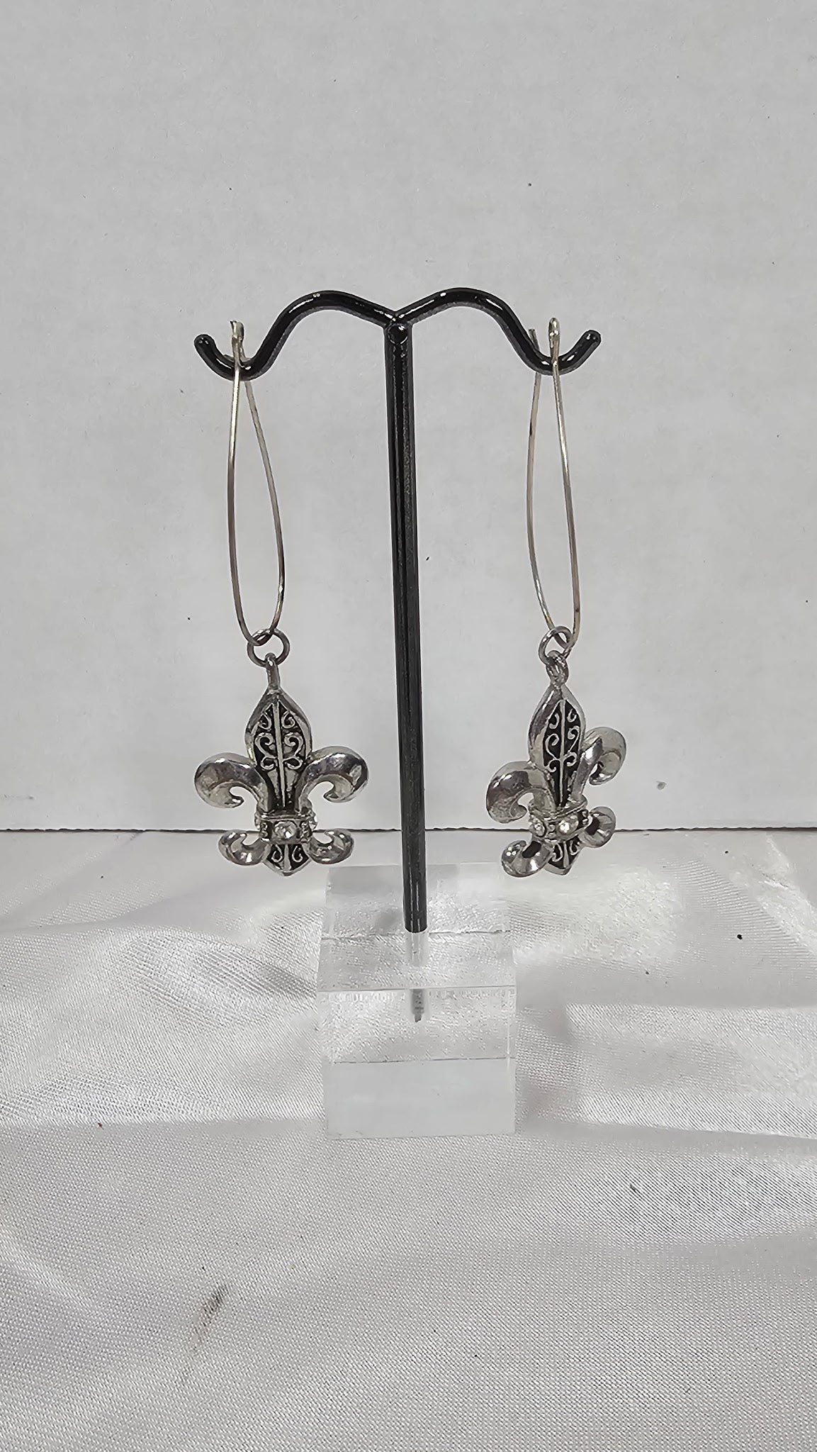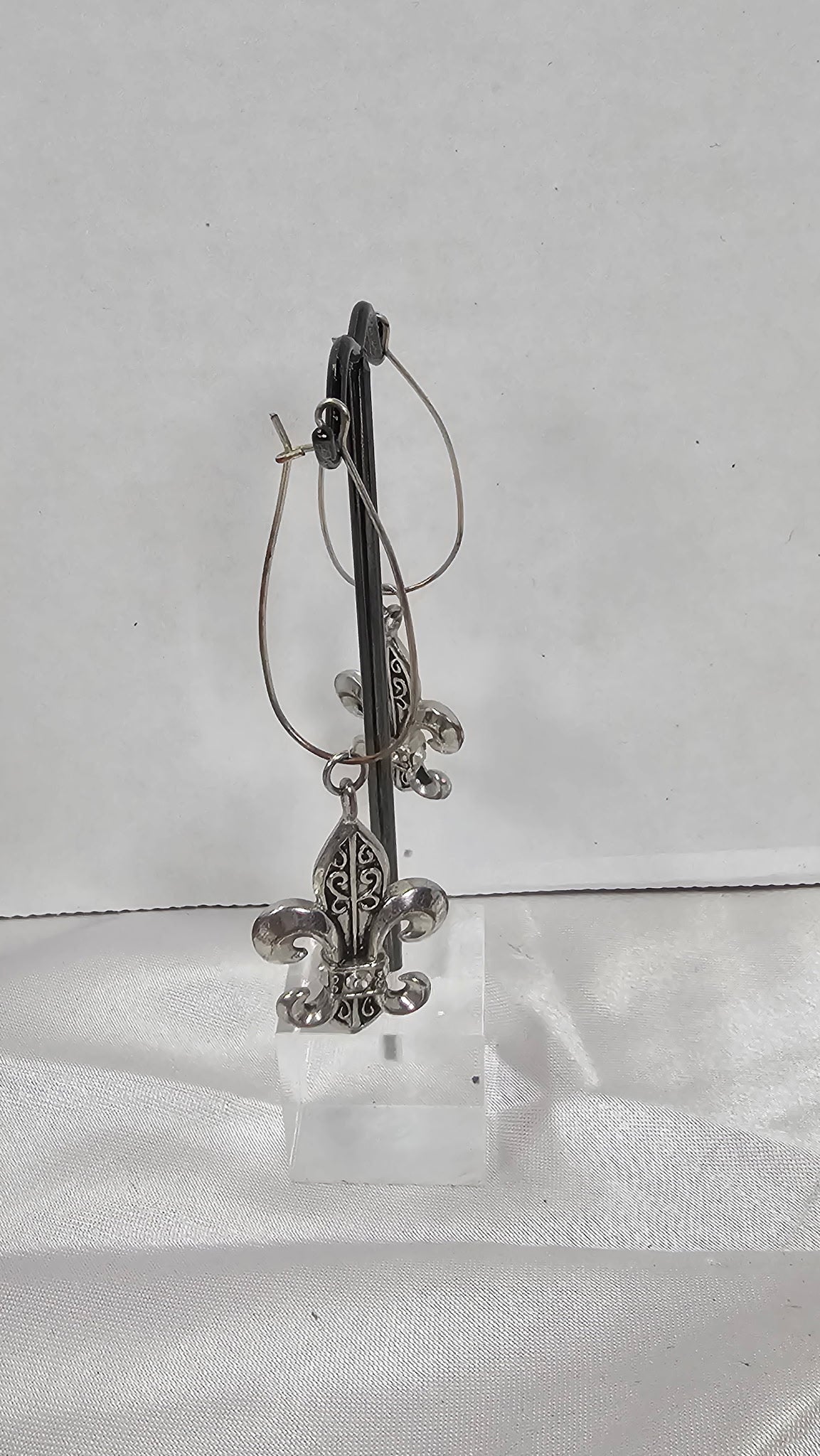 Vintage Silver-Tone Fleur-de-Lis Drop Earrings on Elongated French Hooks
