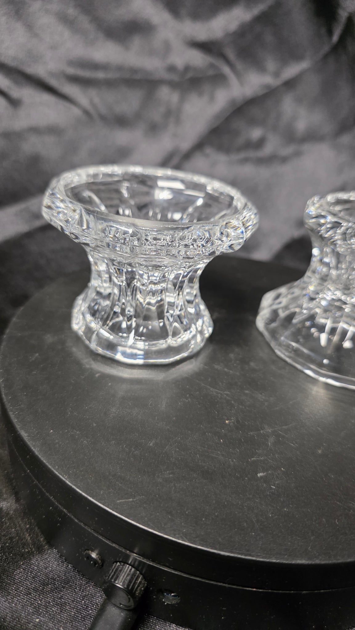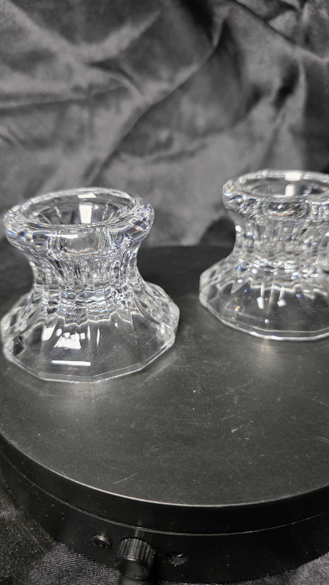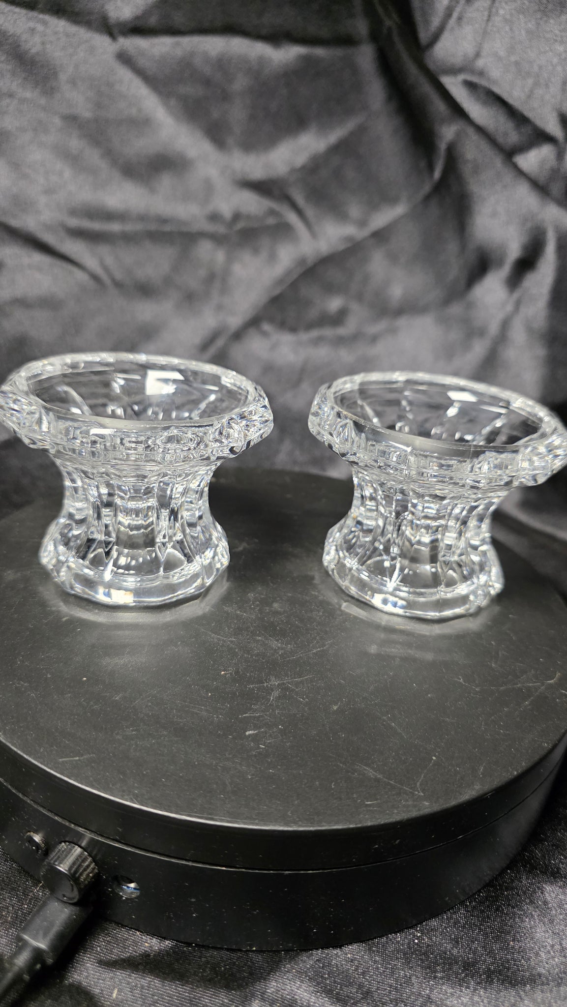 The glass is thick and substantial in hand, giving these holders a stable, grounded presence on a dining table, mantle, or sideboard. Their versatile form allows use with both taper and small pillar candles, making them functional as well as decorative. The profile is reminiscent of classic European pressed-glass designs, often seen in mid-century and earlier decorative tableware.