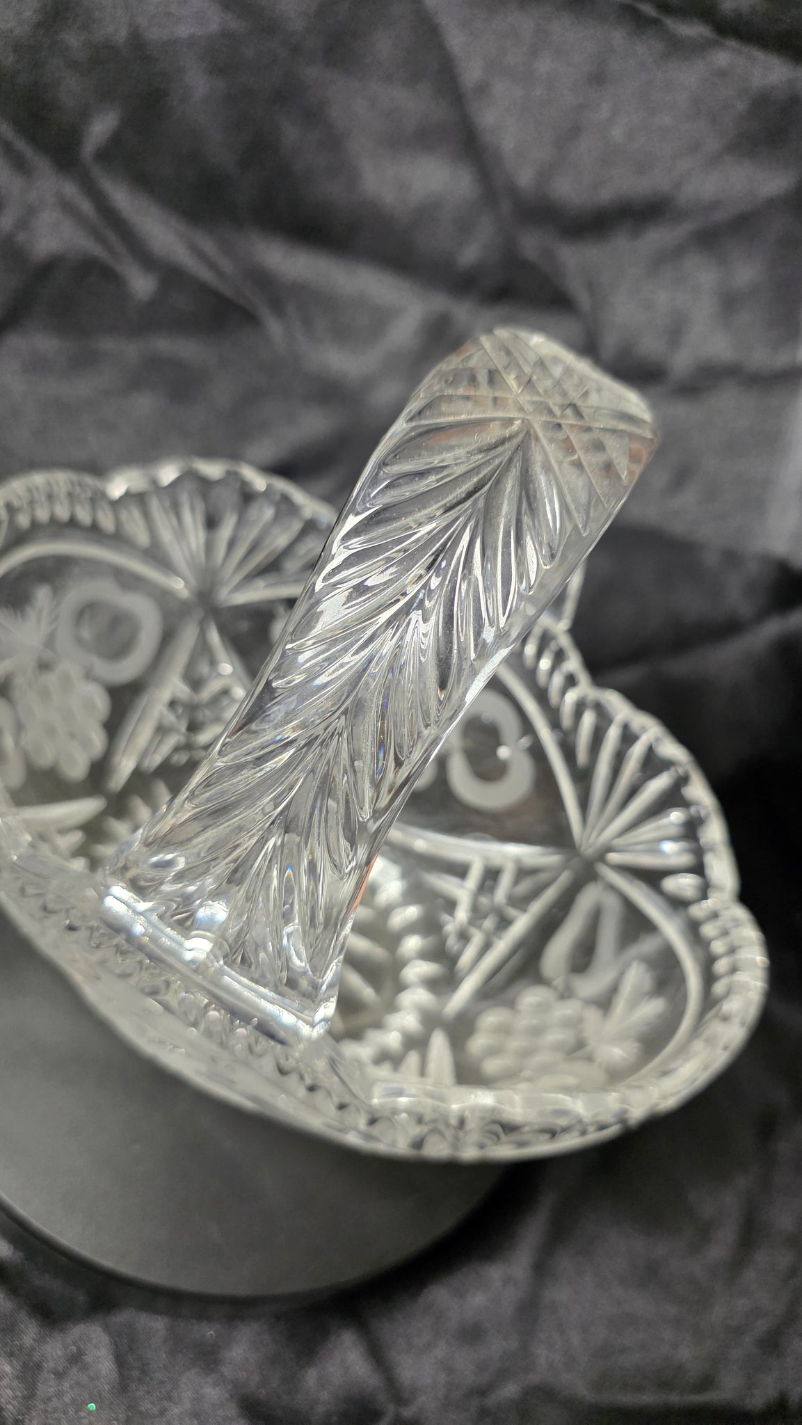This vintage clear cut-glass handled basket presents classic decorative craftsmanship with timeless elegance. The bowl features a scalloped, sawtooth-style rim and deeply pressed or cut paneling that creates strong light refraction and crisp definition throughout the glass. A finely molded handle rises from the rim, displaying a feathered or leaf-like relief pattern that adds sculptural character and visual balance.