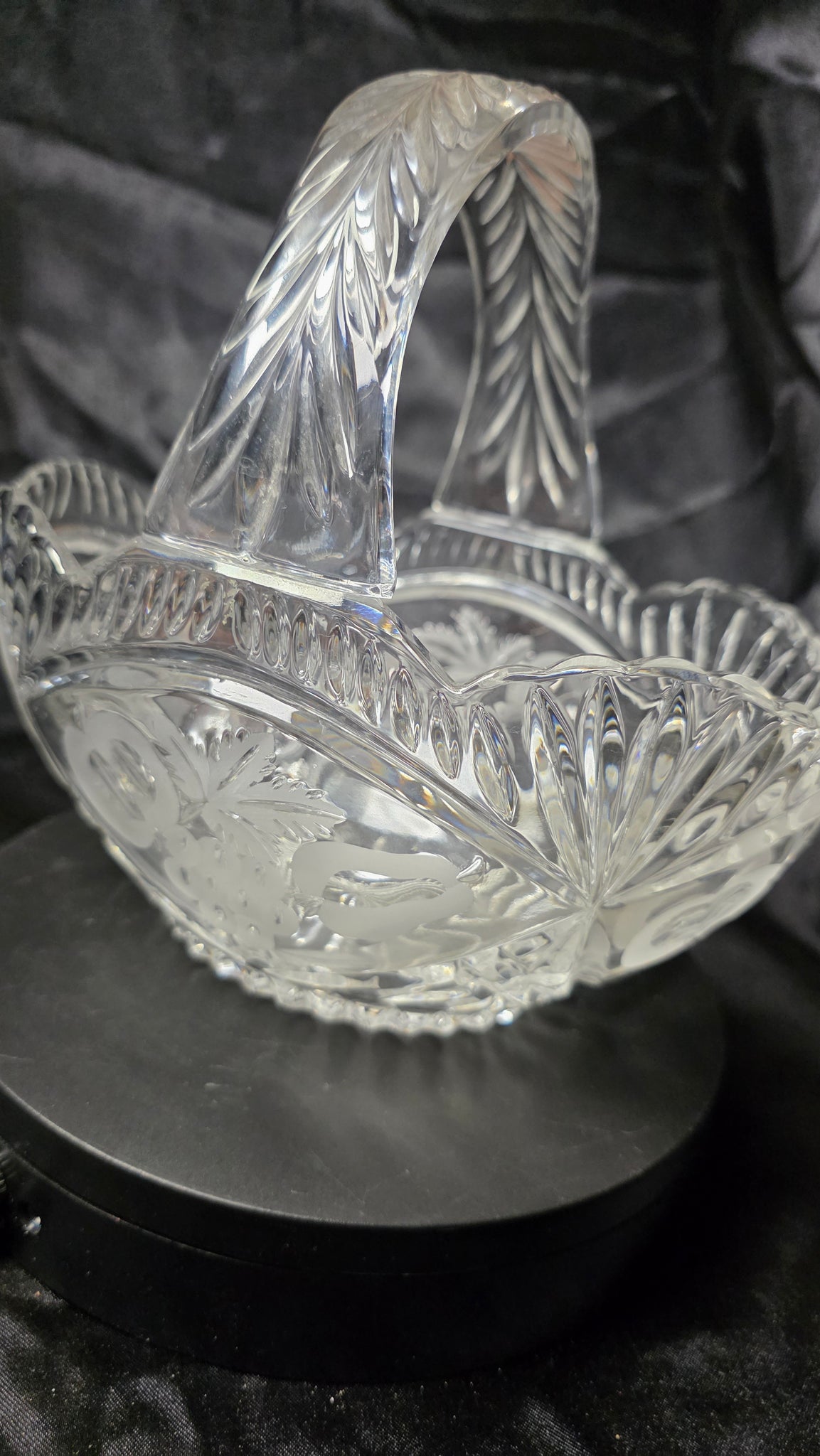 This piece functions beautifully as a fruit bowl, bridal centerpiece, or display basket, offering both decorative presence and practical form. The glass appears clean and bright, with no visible cracks or structural damage noted in the provided images. A classic collectible example of vintage handled decorative glassware, suitable for display, entertaining, or collection.