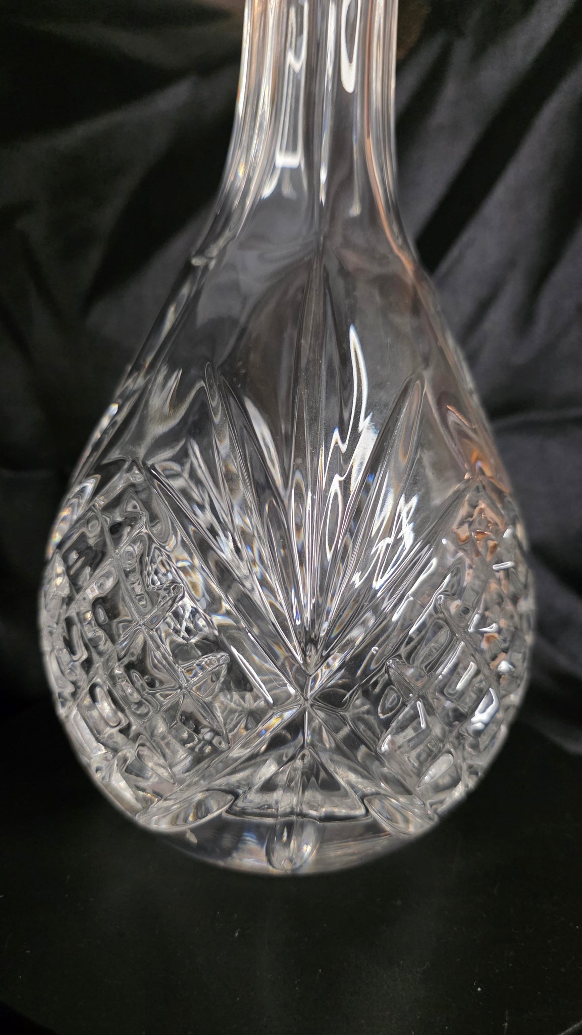 Standing at approximately 11 inches tall, its hand-cut pattern features a brilliant diamond-and-wedge motif, refracting light into intricate bursts of brilliance. The decanter’s base is richly detailed with a starburst cut, creating a visual anchor that dances with reflected light from every angle. Its design echoes the refined craftsmanship of iconic crystal houses such as Waterford’s Lismore and Godinger’s Dublin, with the deep cuts and weight characteristic of fine European lead crystal.