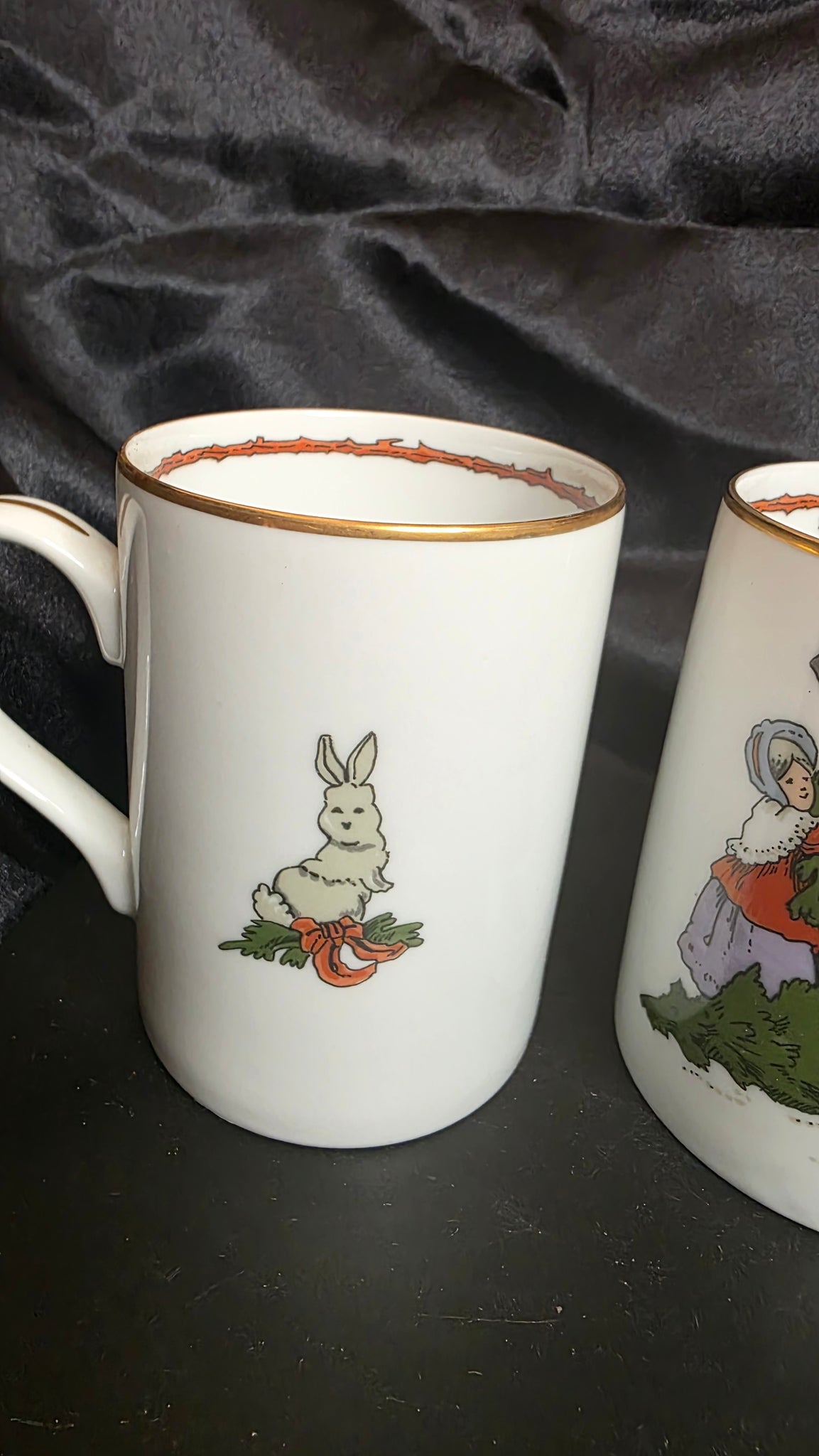 There’s a special kind of Christmas magic that lives in old porcelain. These vintage Fitz & Floyd “Deck the Halls” mugs carry that magic beautifully—capturing a quiet winter moment filled with tradition and togetherness. Produced in 1982 and made in Japan, this charming pair features a hand-illustrated Victorian family bundled against the cold, hauling a freshly-cut evergreen through the snow. On the reverse side of each mug, a whimsical winter bunny sits upon holly leaves and ribbon, almost as if keeping watch over the scene.