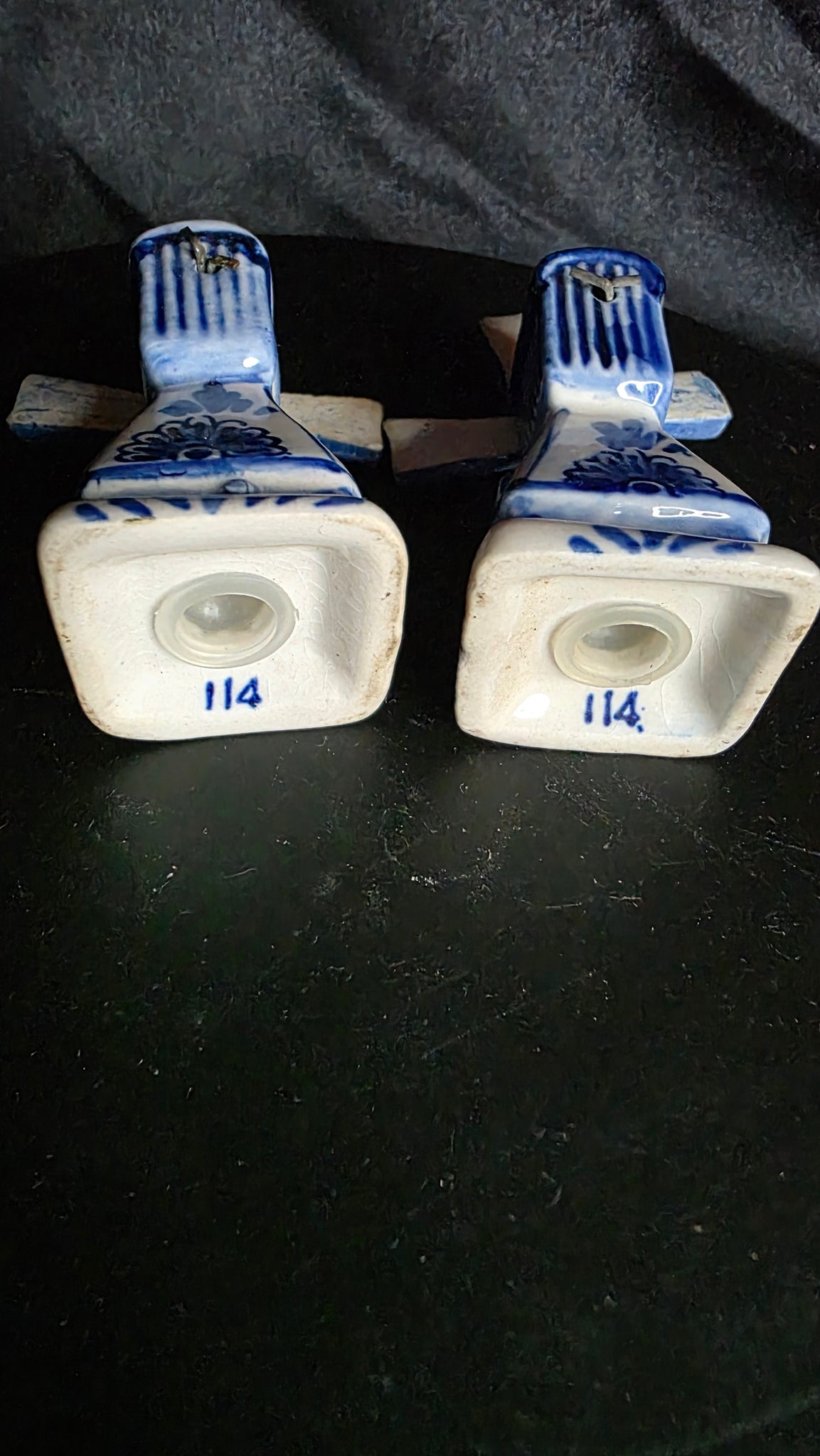Each shaker is hand-painted, featuring intricate cobalt blue floral and geometric motifs against a crisp white glaze. The windmill blades, delicately modeled and affixed with small brass pins, are functional and can gently rotate—adding an authentic touch of whimsy and movement. The bases are marked with hand-painted numbers (“114”), typical of older production methods, suggesting small-batch craftsmanship rather than mass manufacturing.