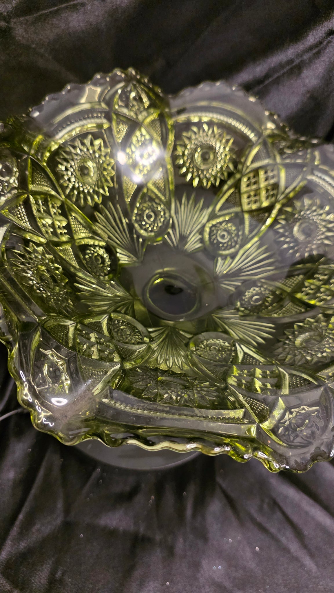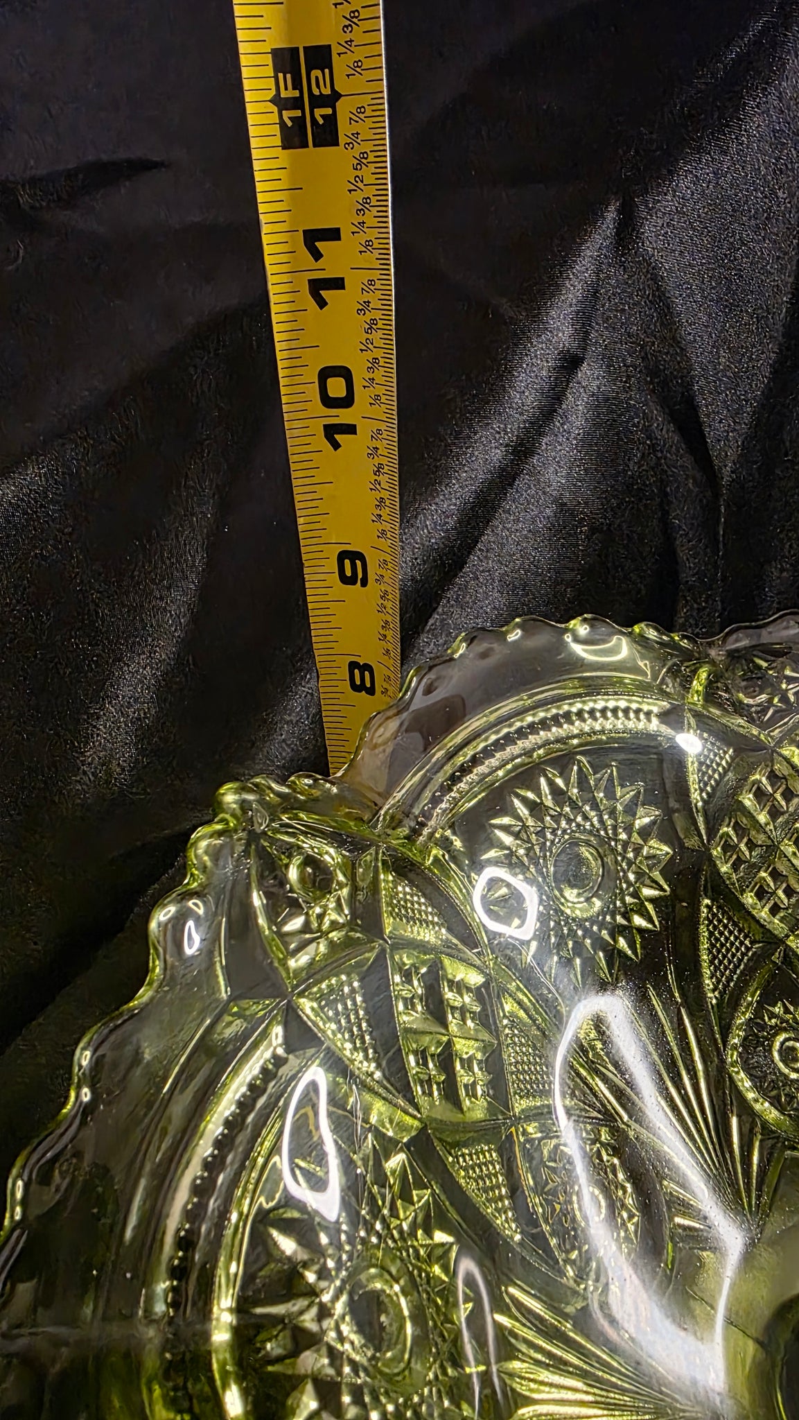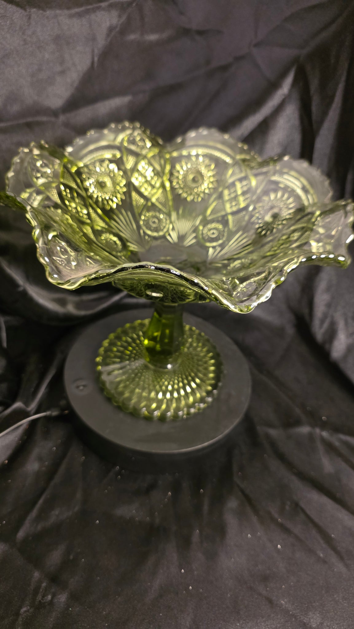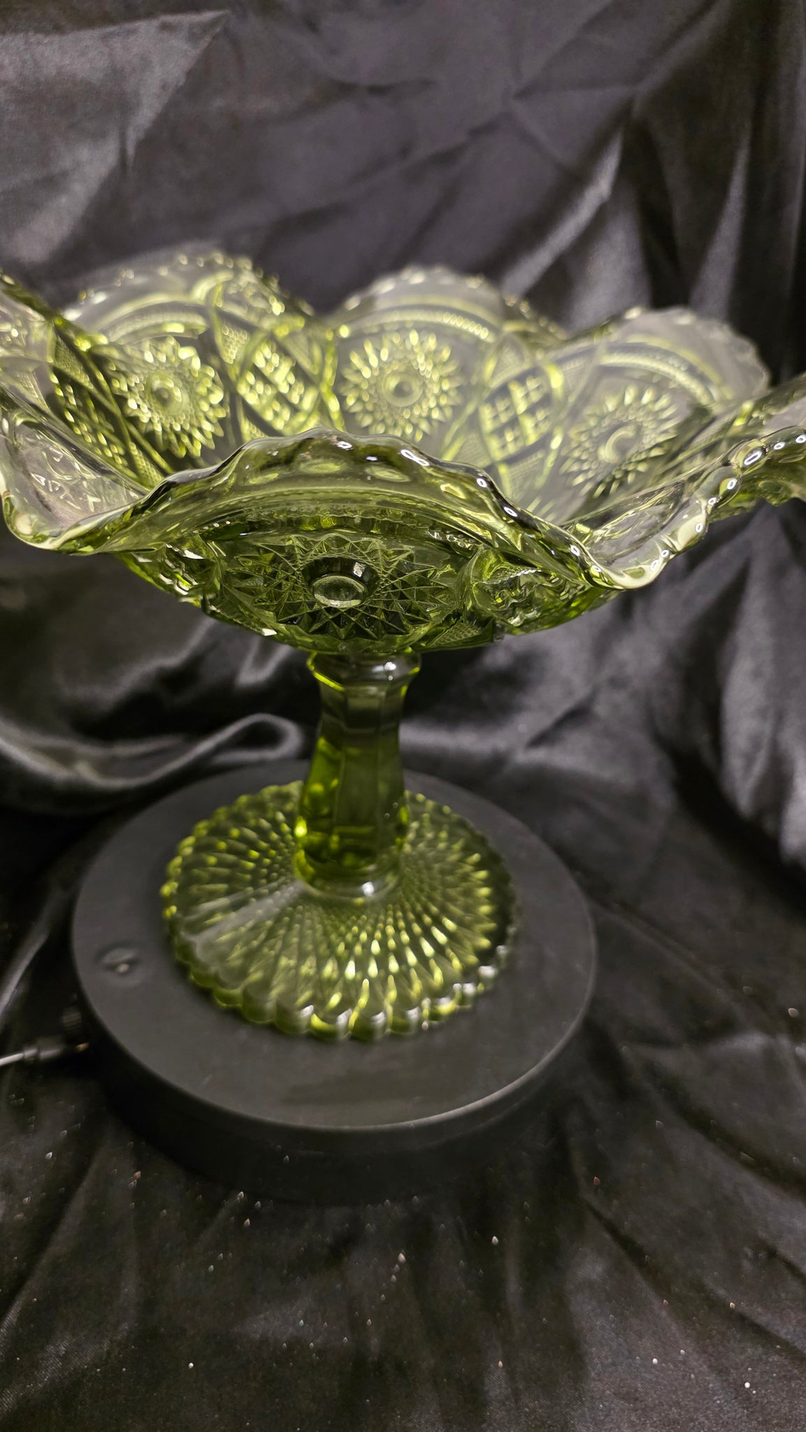 There is a certain glow that only vintage pressed glass can achieve—a depth of color and light that feels alive. This Imperial Glass pedestal compote carries that unmistakable presence, rendered in a rich avocado green that shifts beautifully as light moves across its surface. Every angle reveals layered geometry: radiating starbursts, diamond panels, and delicate scalloped edges that speak to both precision and artistry.