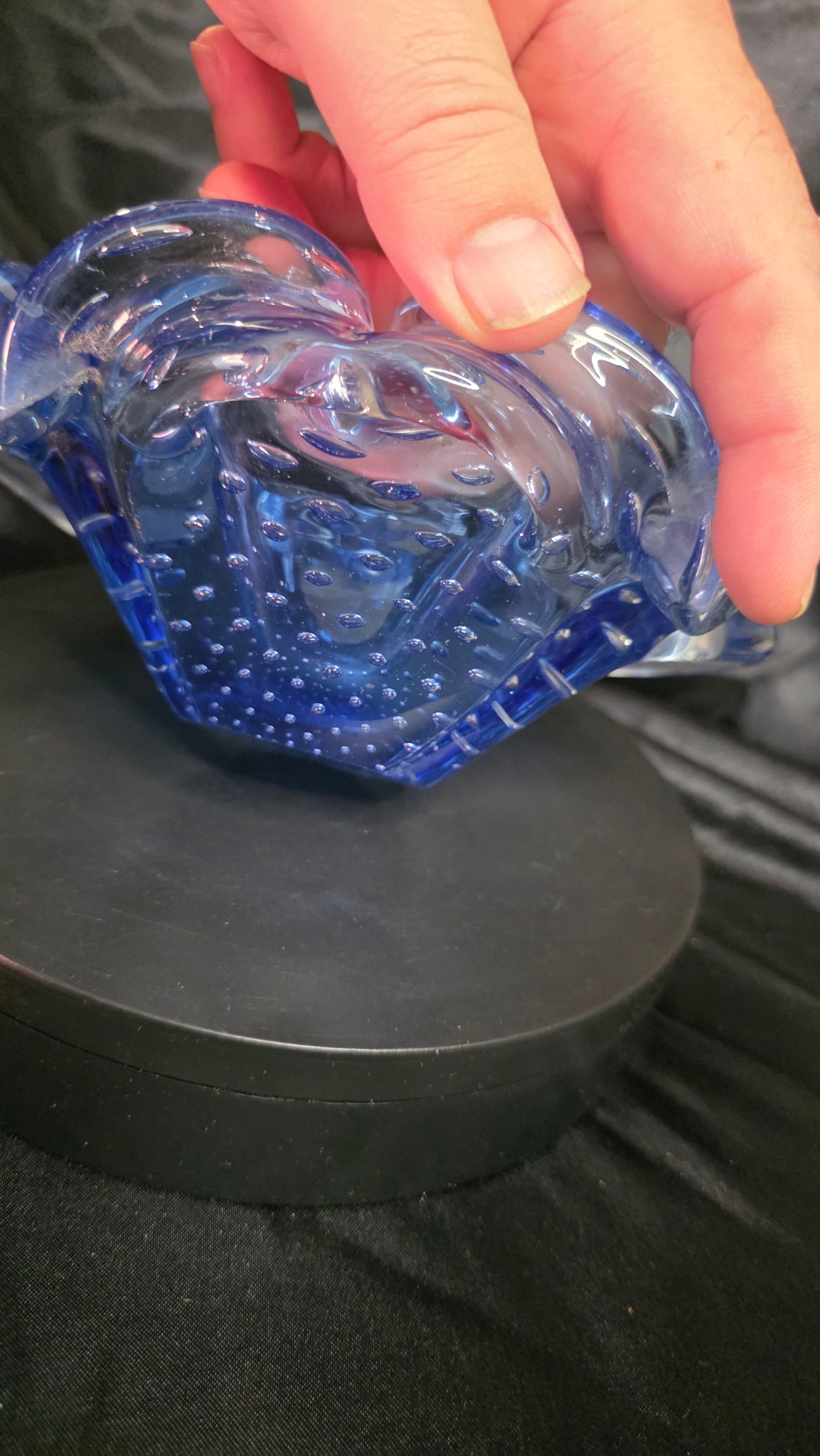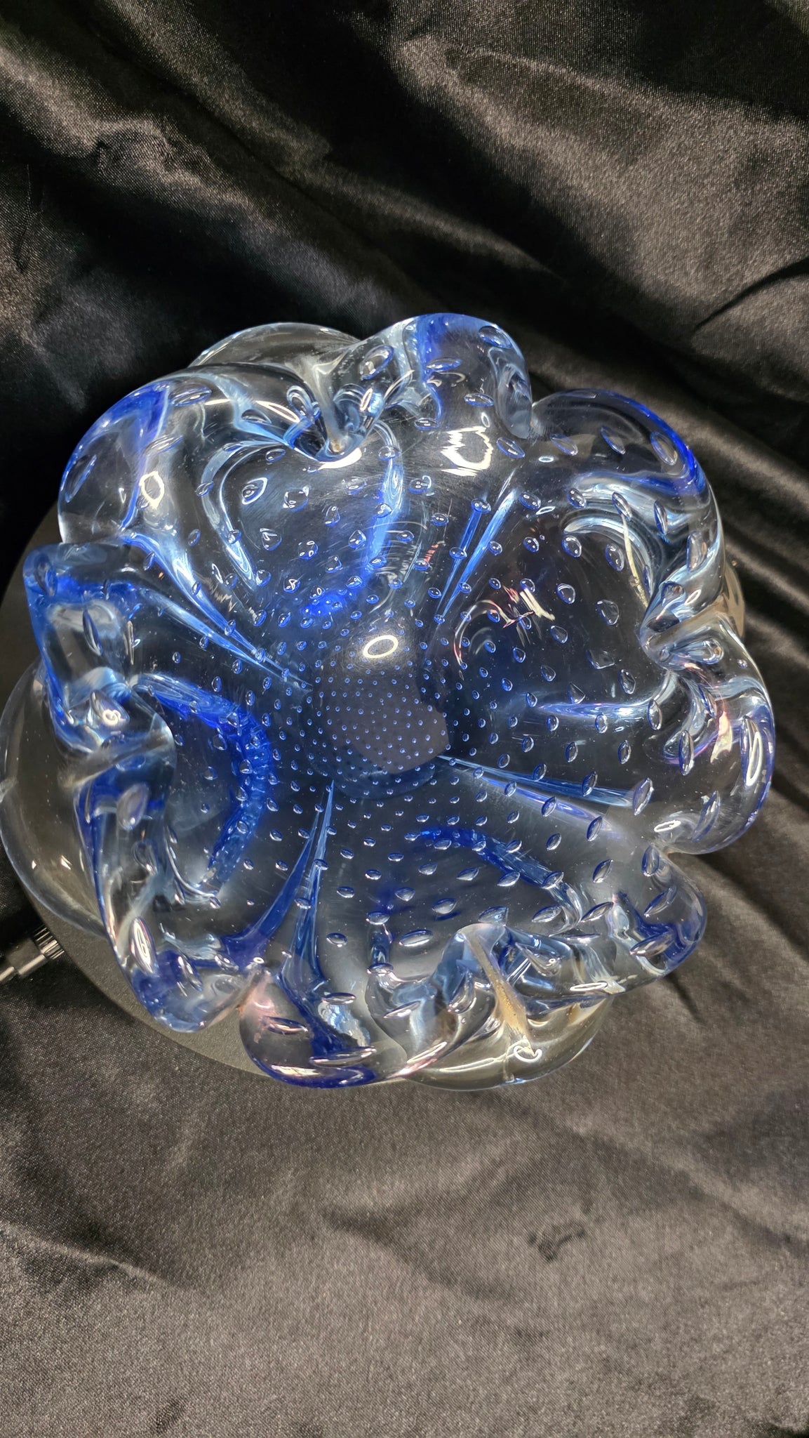Its form blooms like a flower, curling petals of deep ocean blue edged in clear glass. Heavy in weight, wonderfully sculptural, it rests solidly on a tabletop while catching and bending light in every direction — soft by daylight, luminous under evening lamps. Pieces like this were often created as ashtrays or decorative catchalls, but today they serve as center bowls, jewelry rests, candy dishes, or simply art for a room that deserves something special.
