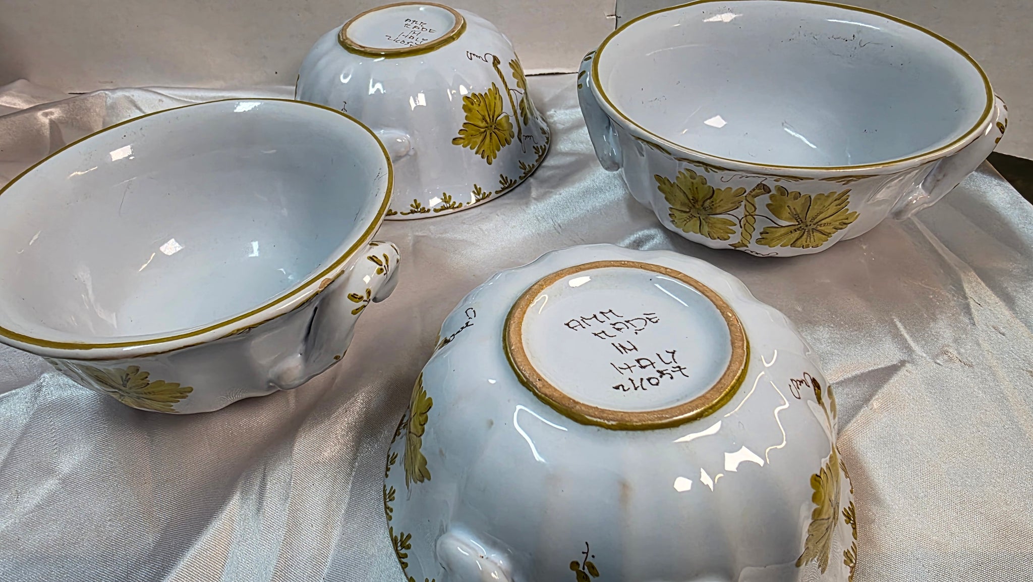 Vintage Italian Majolica 4-Piece Bowl Set – Hand-Painted Leaf Motif – Mid-Century Faience – Italy