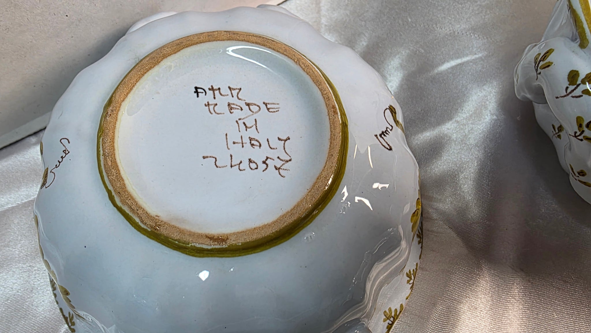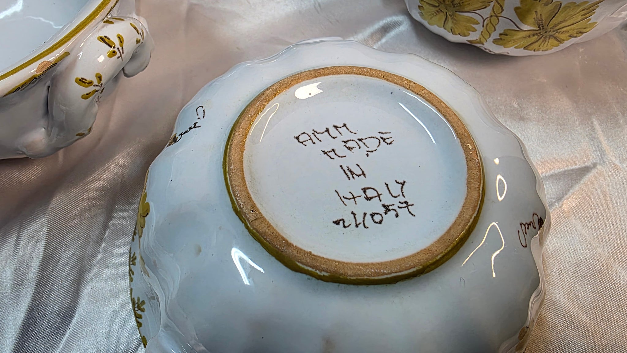 This style of majolica is closely associated with mid-20th-century Italian workshops, particularly those operating in regions such as Faenza and Vietri, and aligns aesthetically with works influenced by celebrated ceramicists like Guido Gambone. Whether paired with the matching tureen or enjoyed as a standalone set, these bowls offer cohesive design, period authenticity, and enduring decorative appeal.