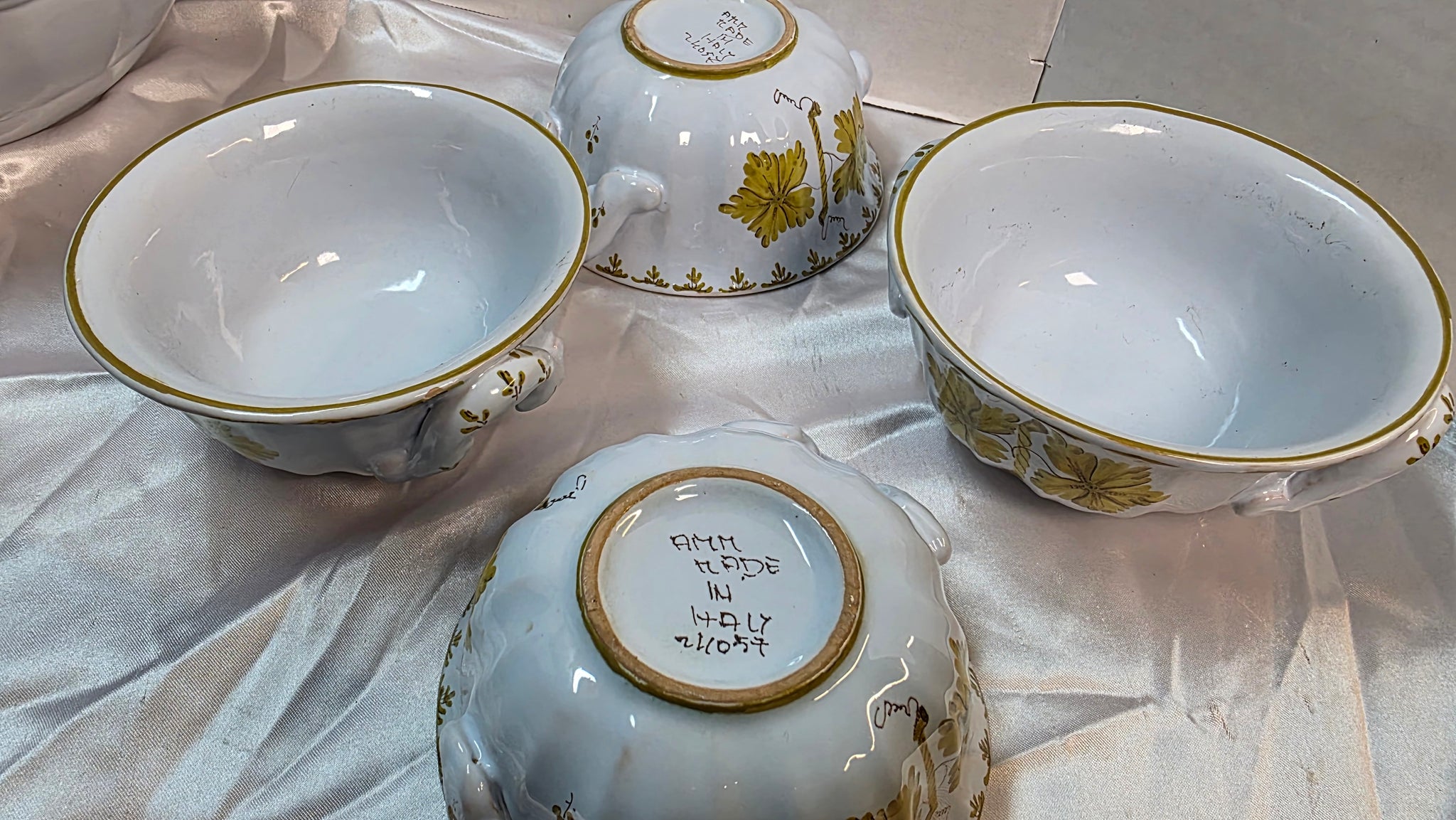 This vintage set of four Italian majolica bowls reflects the same mid-century ceramic tradition as the accompanying soup tureen, sharing both palette and painterly language. Each bowl is formed in a softly contoured shape and finished in a pale celeste blue glaze, serving as a subtle canvas for hand-painted leaf motifs rendered in olive-green and warm golden tones. The brushwork is expressive and confident, emphasizing craftsmanship over uniformity.