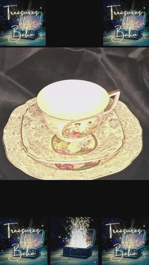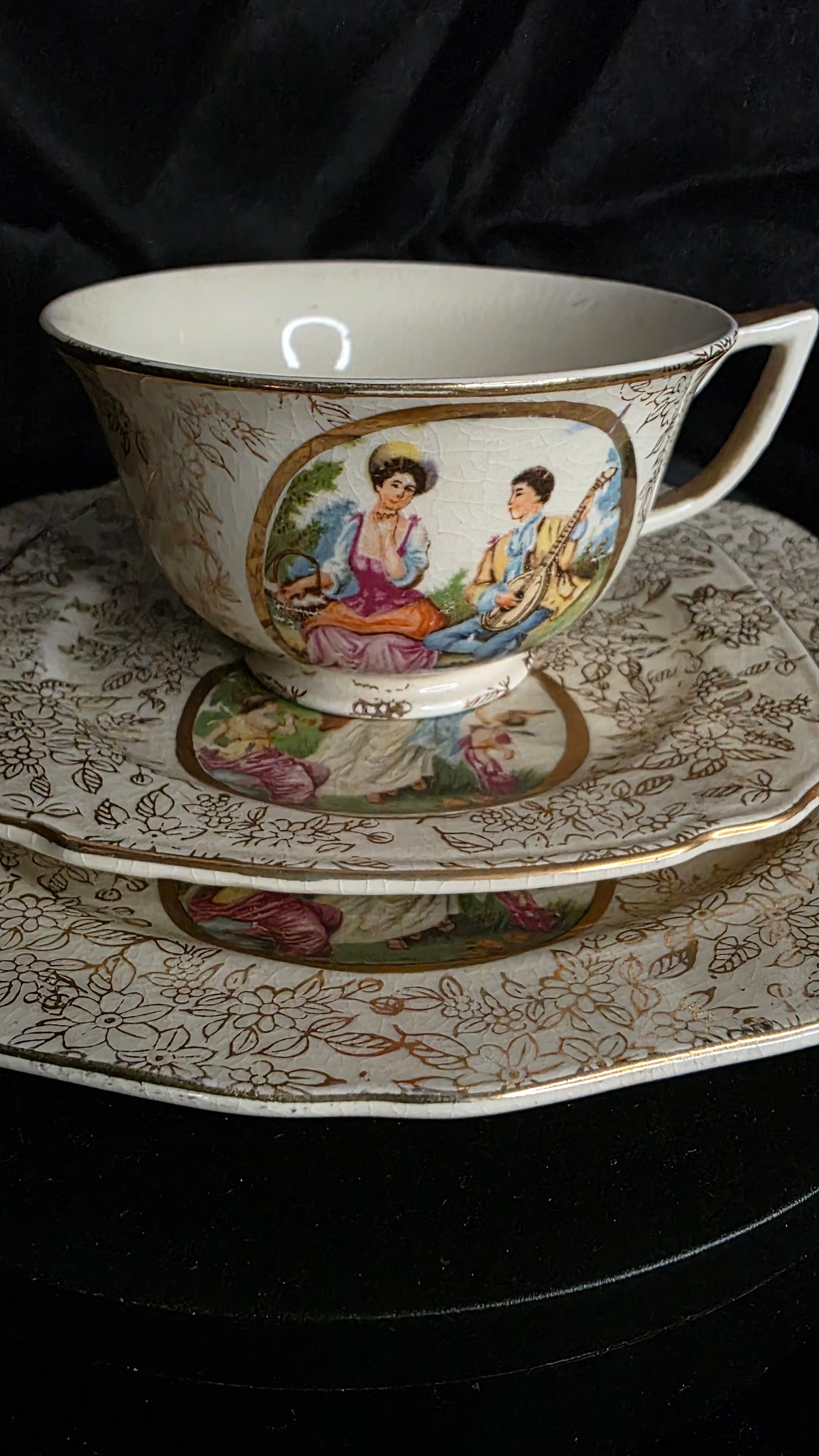 Light, age-appropriate wear to gilding and surfaces is consistent with careful decades of display and is shown in the photos. If you collect courting-scene china (often called “Watteau,” “courting couple,” or “rococo revival”), Japanese exports, or tea trios from the Occupied-Japan era forward, this piece pairs beautifully with Arnart-type transfers and other gilt floral services. Explore more glass, china, and tea-time curios at TreasuresOfBako.com.