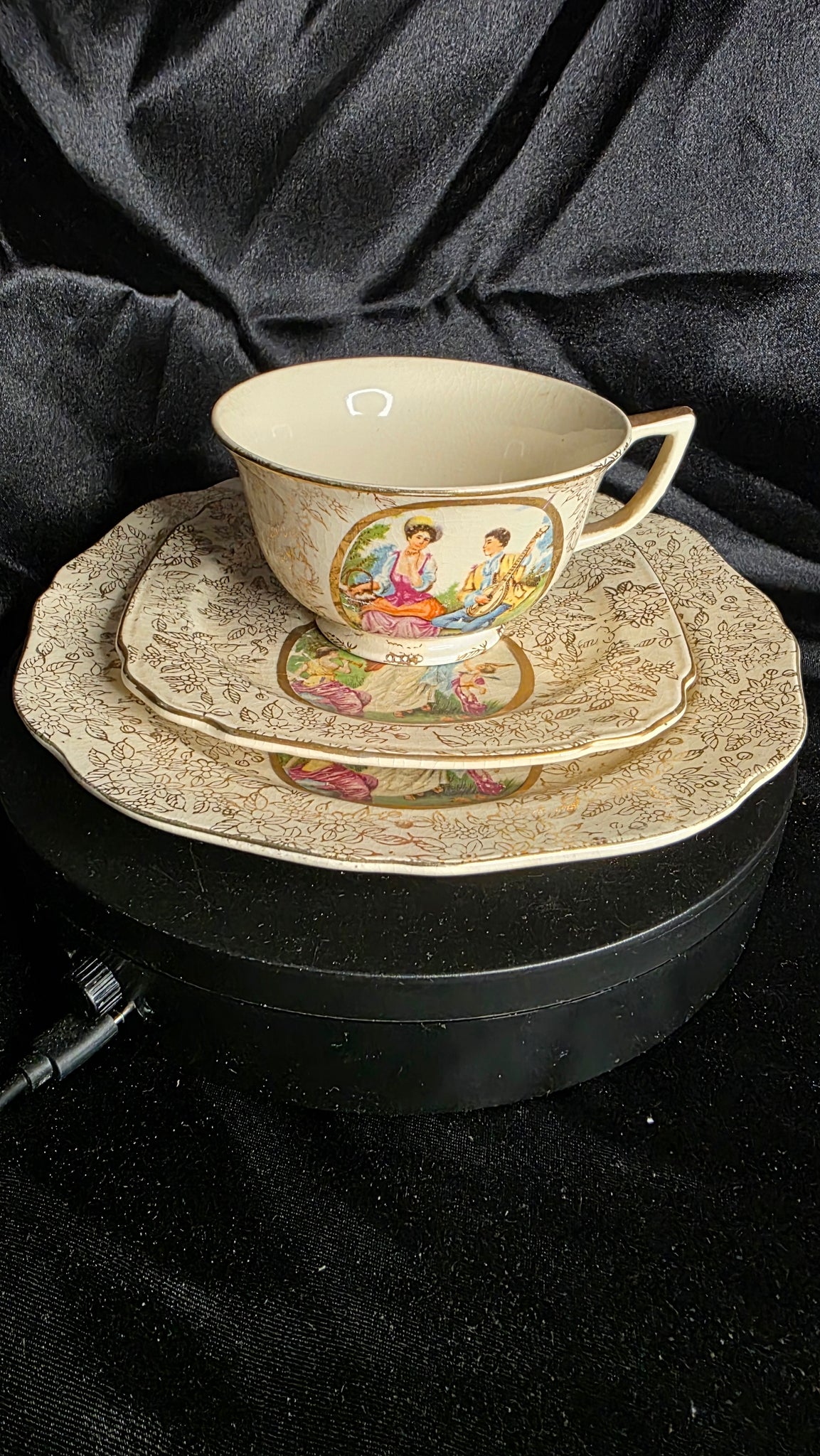 Bring a whisper of salon romance to your table with this Japanese tea trio—a classic “cup, saucer, and side plate” set decorated in the beloved Watteau-style courting scene. Soft pastels and burnished gold scrollwork frame a pastoral vignette of musicians and lovers, while a halo of floral sprigs and filigree gilding catch the light with every turn. The cup’s graceful profile balances a comfortable handle; the saucer and plate echo the motif with scalloped rims, gilt accents, and a luminous glaze that feels elegant in the hand.