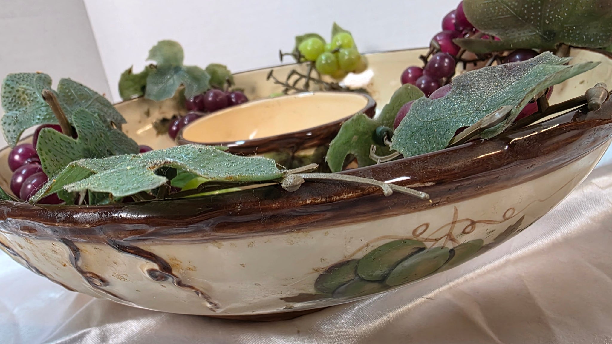 This vintage Pacific Rim Sonoma serving bowl captures the relaxed elegance of wine-country entertaining through richly detailed ceramic craftsmanship. The piece features a generously sized outer bowl accented with sculpted grape clusters and winding vine motifs, all hand-painted to evoke the warmth and abundance of a vineyard harvest.