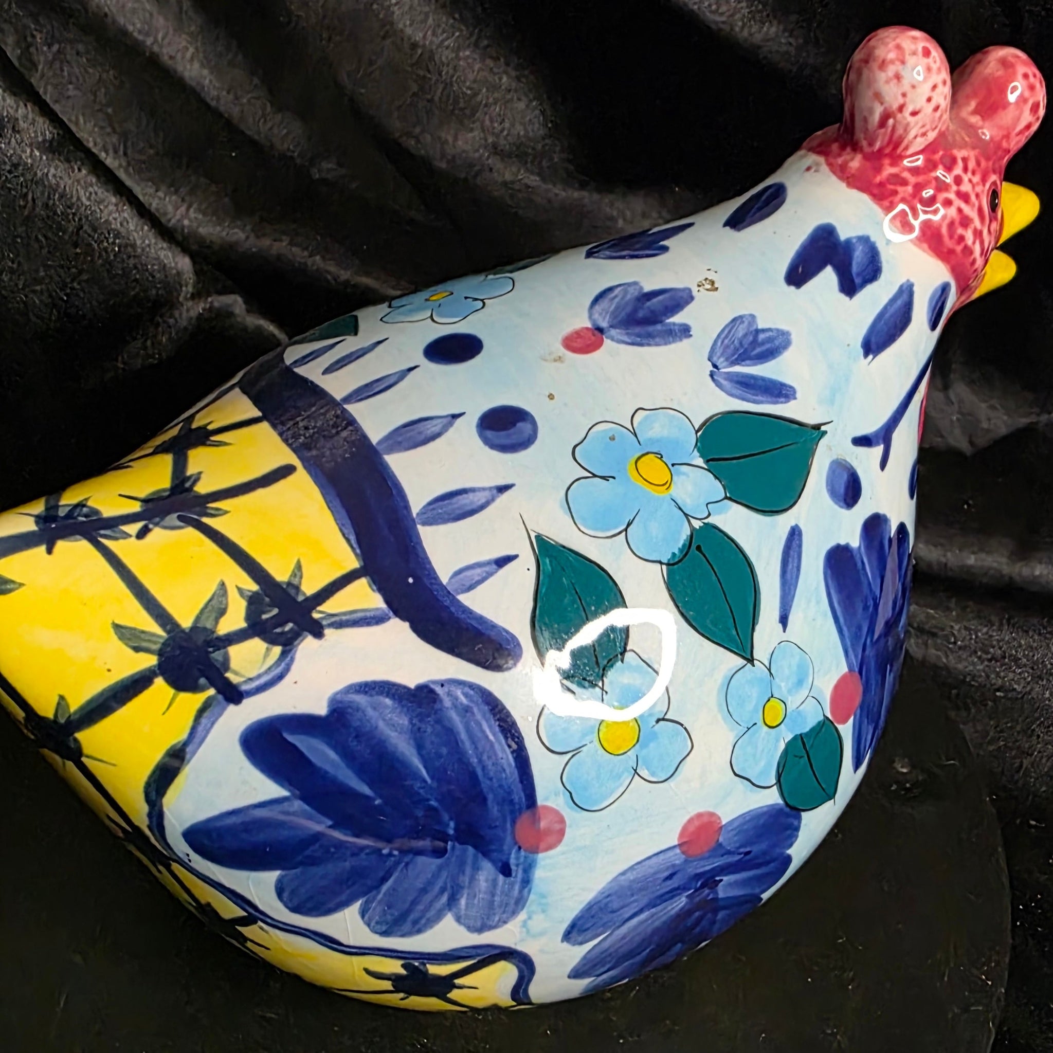 In the soft hush of a blooming garden, where blue forget-me-nots unfurl like whispered secrets and hens peck at sun-warmed earth, this charming hand-painted ceramic hen figurine emerges as a delightful nod to rustic joy. Perched on its flat base for stable display, the 8-inch oval form captures a plump hen with a rosy red comb and sunny yellow beak, her creamy white body splashed with free-spirited brushstrokes of cobalt blue flowers, lush green leaves, and playful dots that evoke a meadow in full color. The subtle curve and glossy glazes give her a lively presence, as if she's just paused mid-strut to survey her domain.