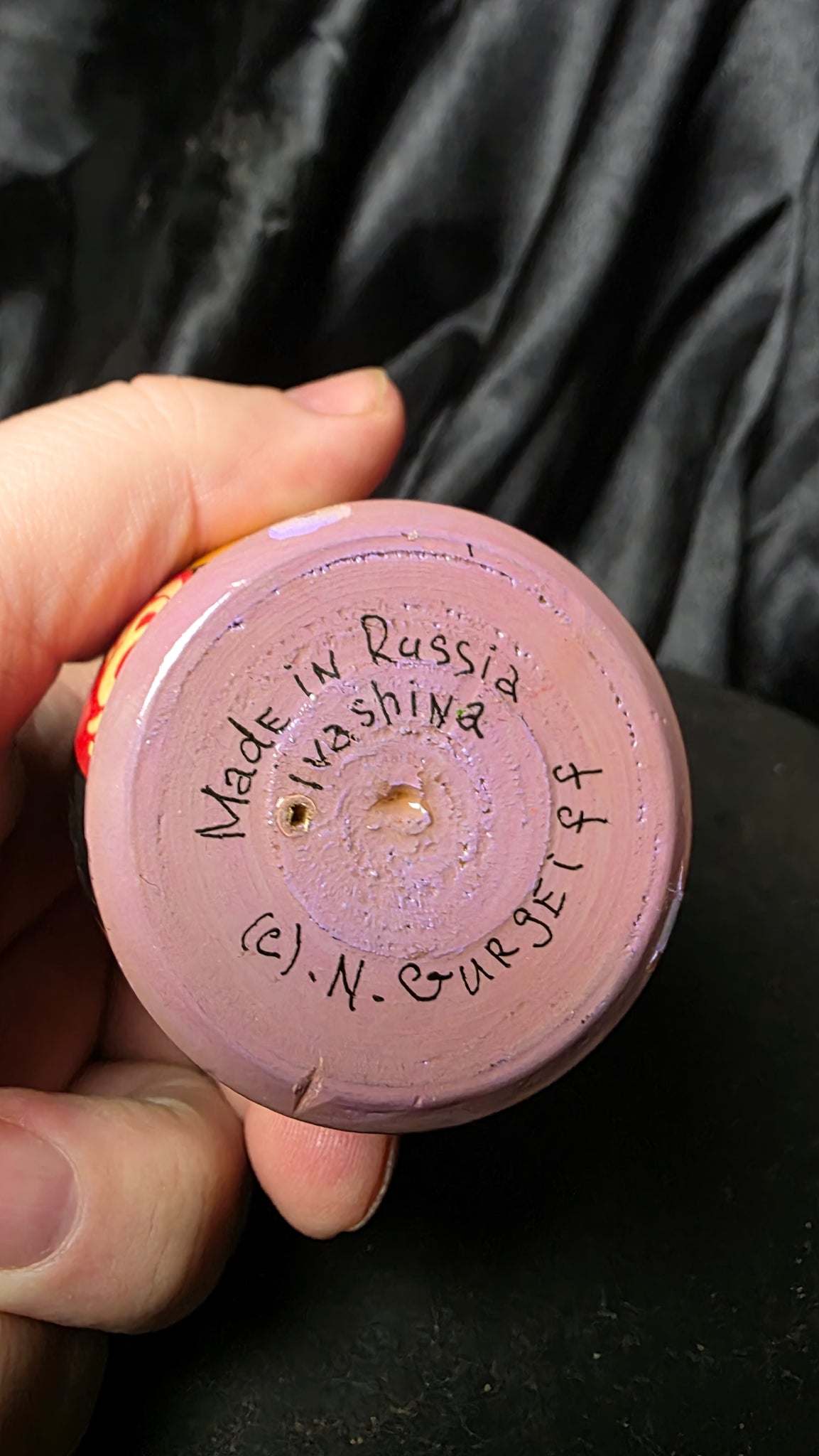 Signed on the base by artists Ivashina and Nicolay Gurgeiff, this set reflects the artistry associated with Russian craft centers known for producing collectible nesting dolls. Gurgeiff, in particular, is recognized for creating uniquely themed pieces that blend classic Matryoshka tradition with imaginative subject matter, making this set especially appealing to collectors seeking something beyond the ordinary.