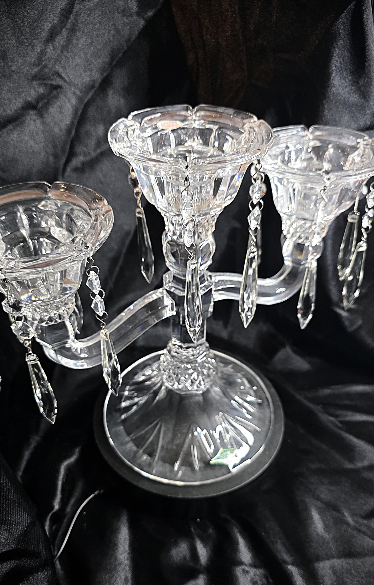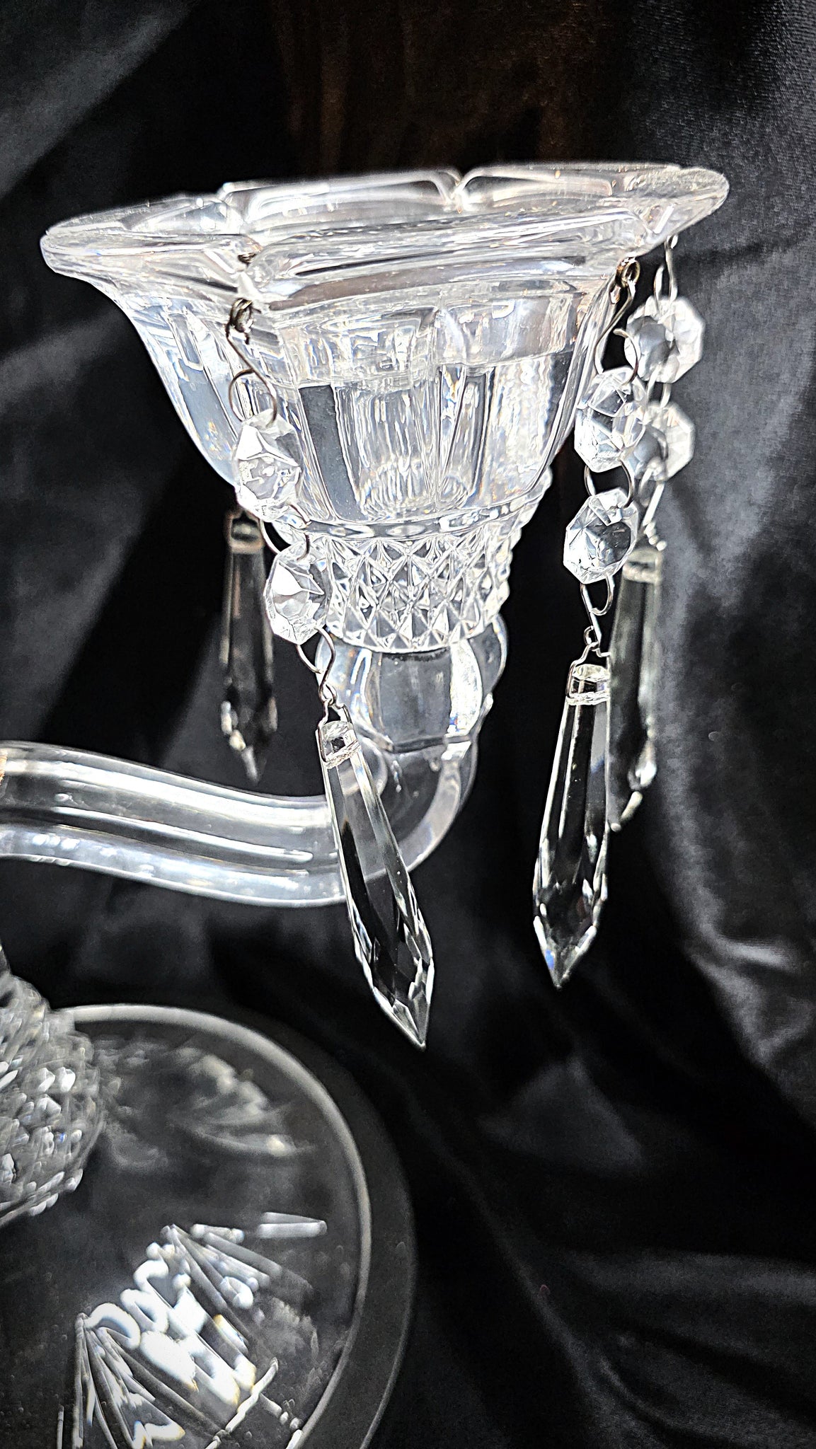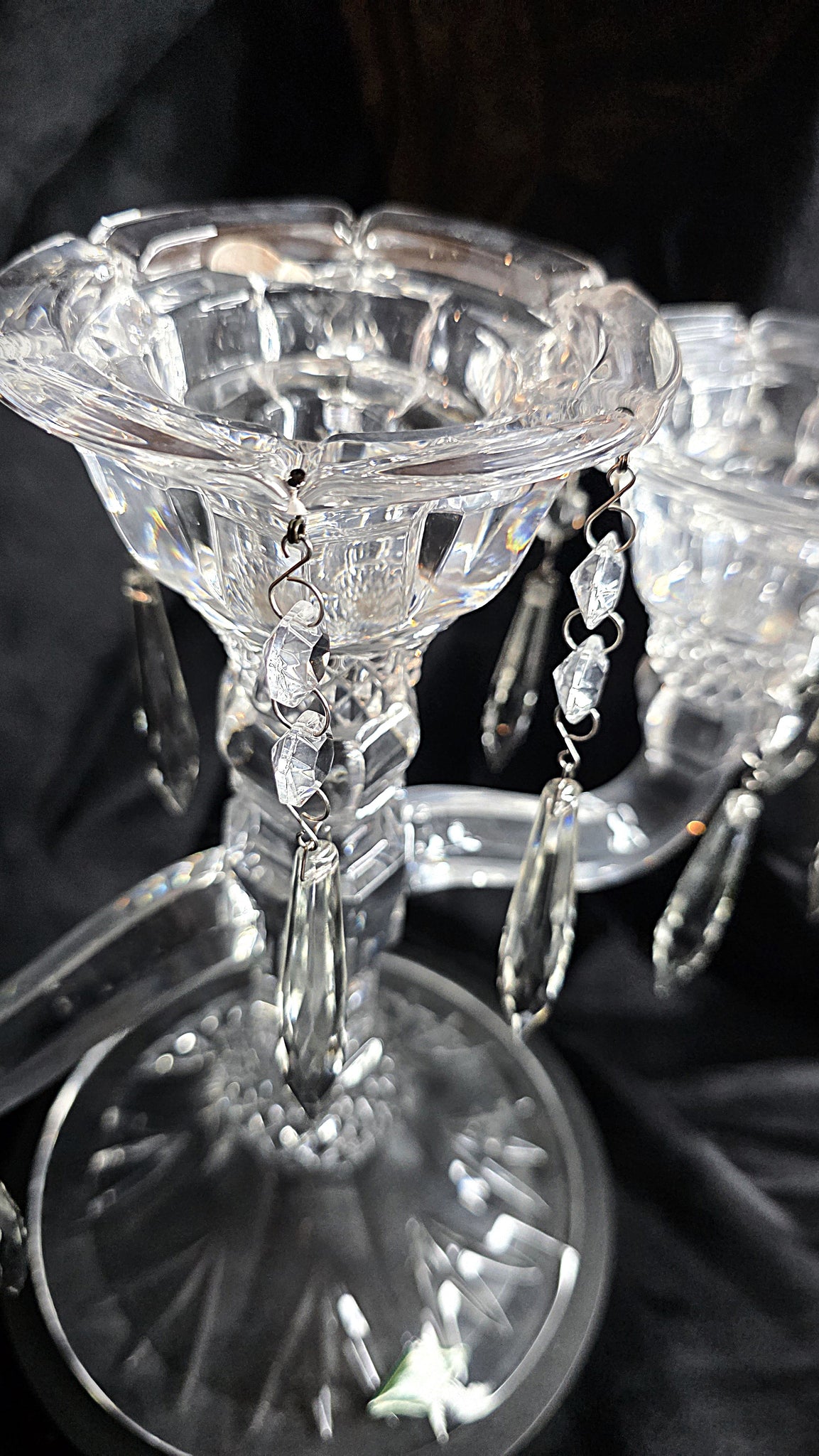 Each arm curves outward in a graceful, fluid sweep, supporting sculpted candle cups whose flared rims cascade downward into intricate, diamond-cut detailing. From these cups hang delicate strands of faceted prisms—crystal drops that sway gently with even the slightest movement. When candlelight plays across them, they awaken in a soft choreography of sparkle and shadow, bringing warmth, movement, and romance to the room.