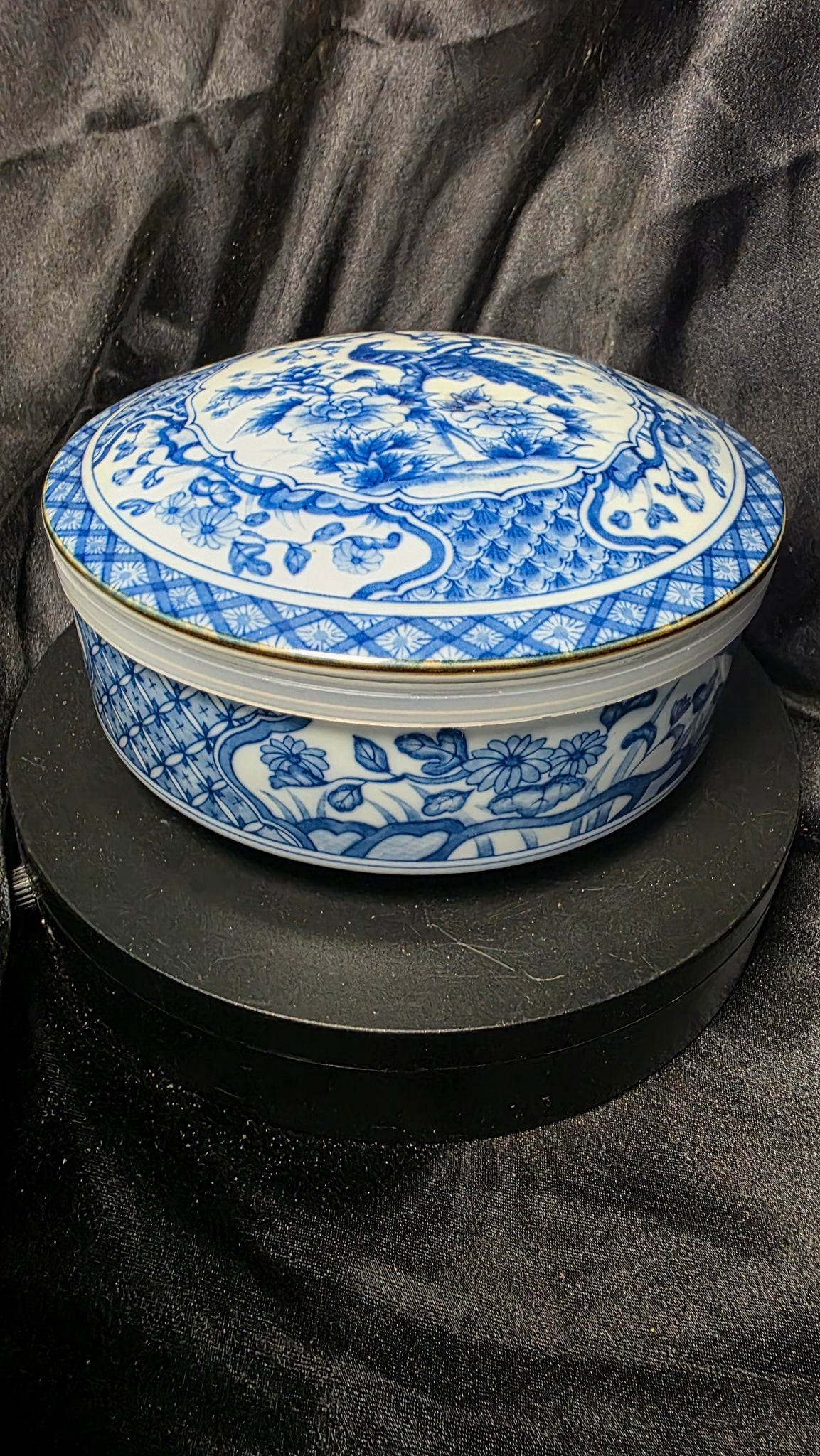Whether styled as a trinket box, candy dish, jewelry holder, or decorative keepsake container, this piece delivers both function and visual sophistication. The blue peacock motif remains a highly collectible design, admired for its symbolism of beauty and refinement, making this an elegant addition to any curated porcelain or chinoiserie collection.