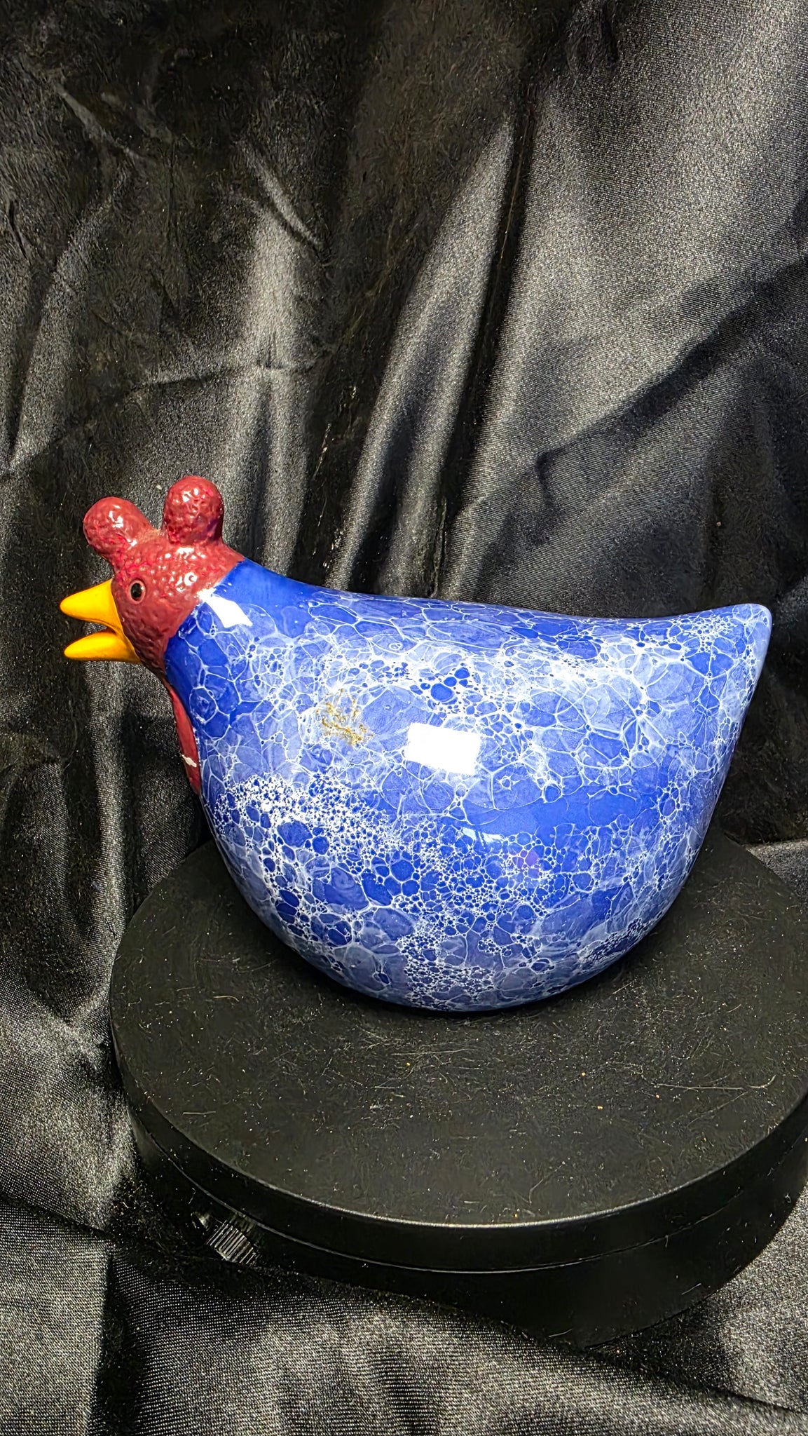The body features a rich cobalt blue glaze enhanced with an intricate marbled, spongeware-style pattern traced in delicate white veining. This layered finish creates visual depth and an almost stone-like character, elevating the hen beyond simple country décor into a striking decorative accent. The high-gloss surface reflects light beautifully, making it equally suited for a kitchen shelf, hutch, or curated display vignette.