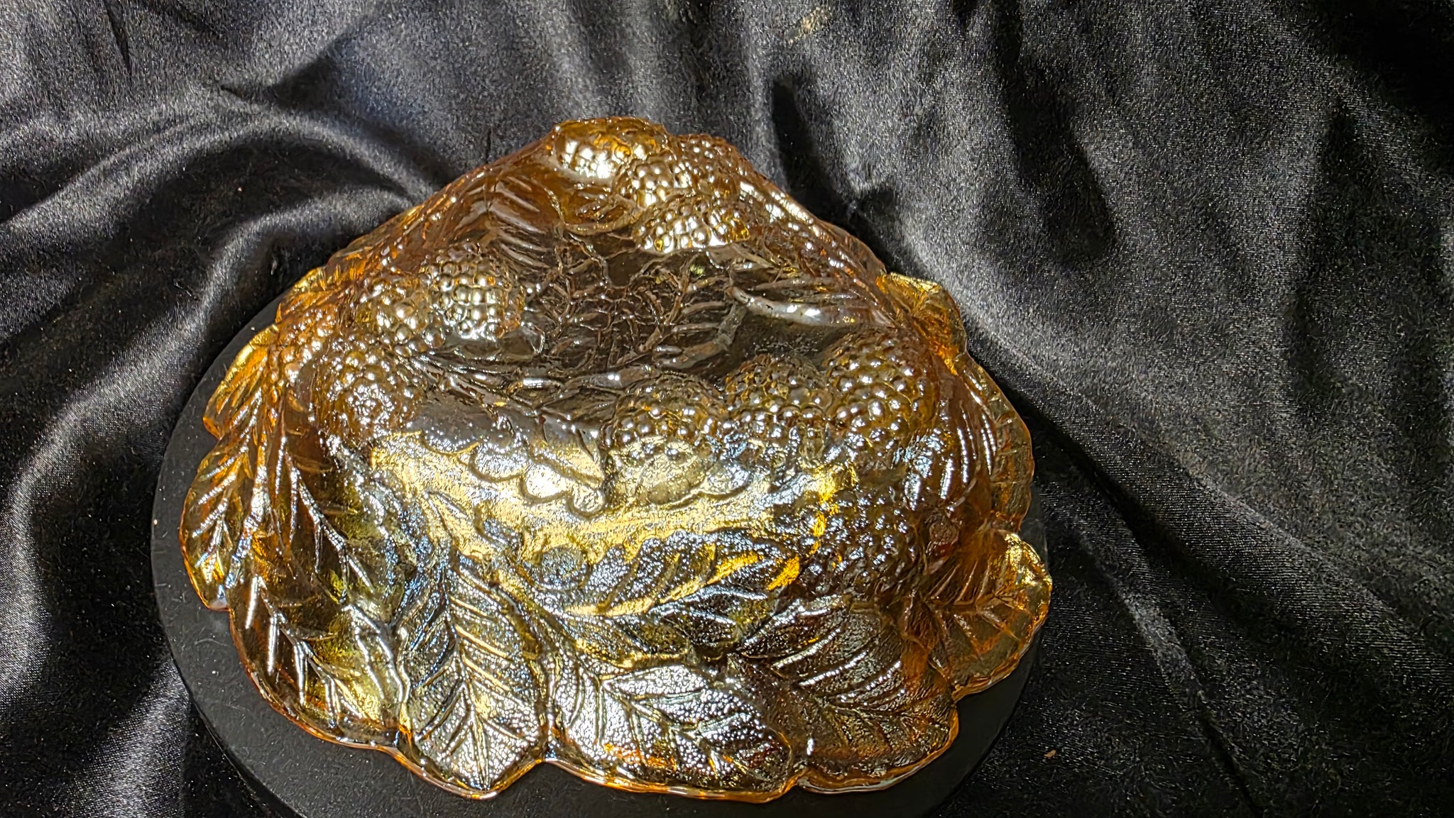 Whether styled as a candy dish, nut bowl, or simply displayed as a statement accent, this piece offers both functional charm and collector-worthy character. Its vibrant iridescence and intricate botanical design make it an eye-catching addition to any curated glass collection or vintage-inspired interior.