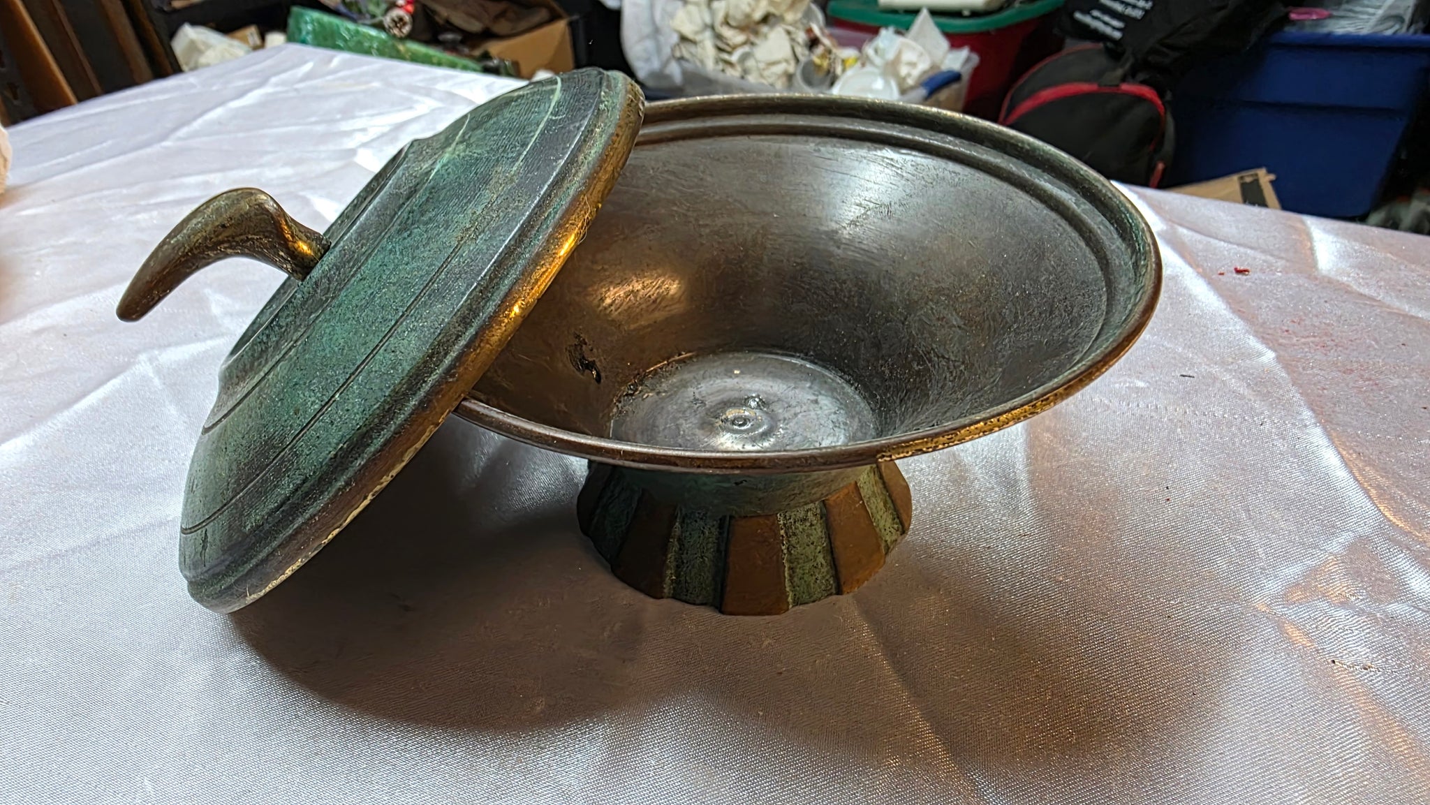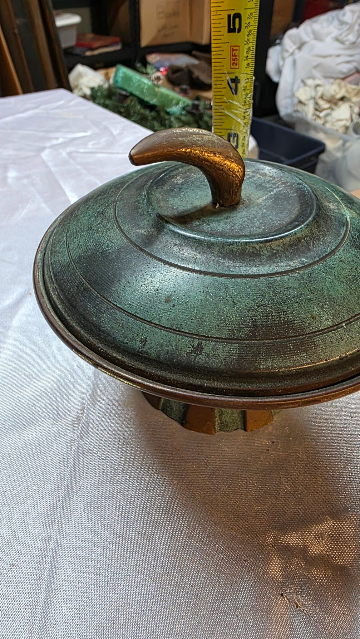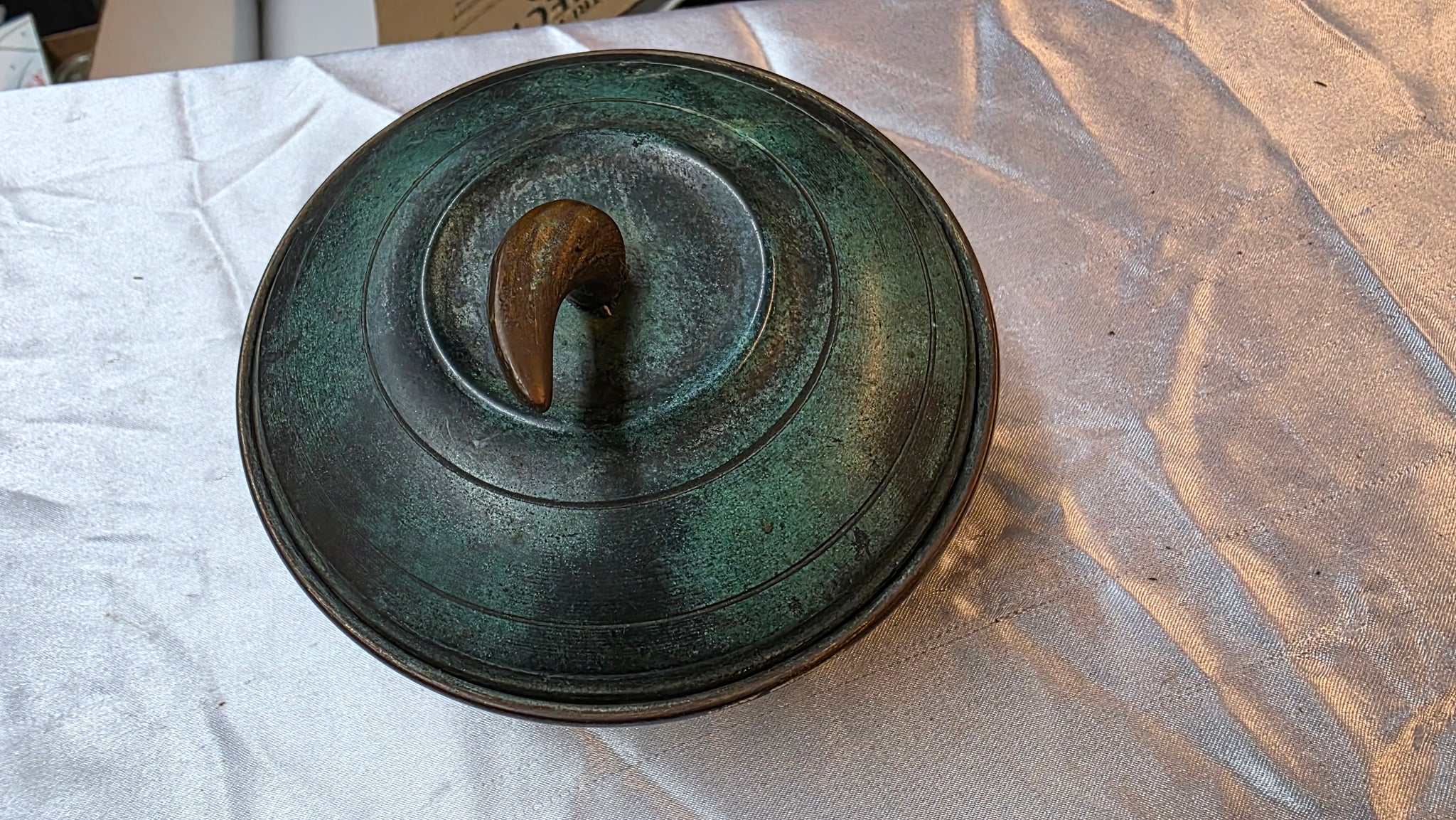 Rich with character and unmistakable presence, this vintage Israeli brass bowl captures the artistic spirit that defined mid-century metalwork in the young State of Israel. Cloaked in a beautifully developed verdigris finish, the surface reveals layered tones of deep green and aged bronze that create a naturally dramatic patina collectors continue to admire. The gracefully curved lid is crowned with a sculptural finial, lending the piece an elevated silhouette that feels both intentional and timeless.