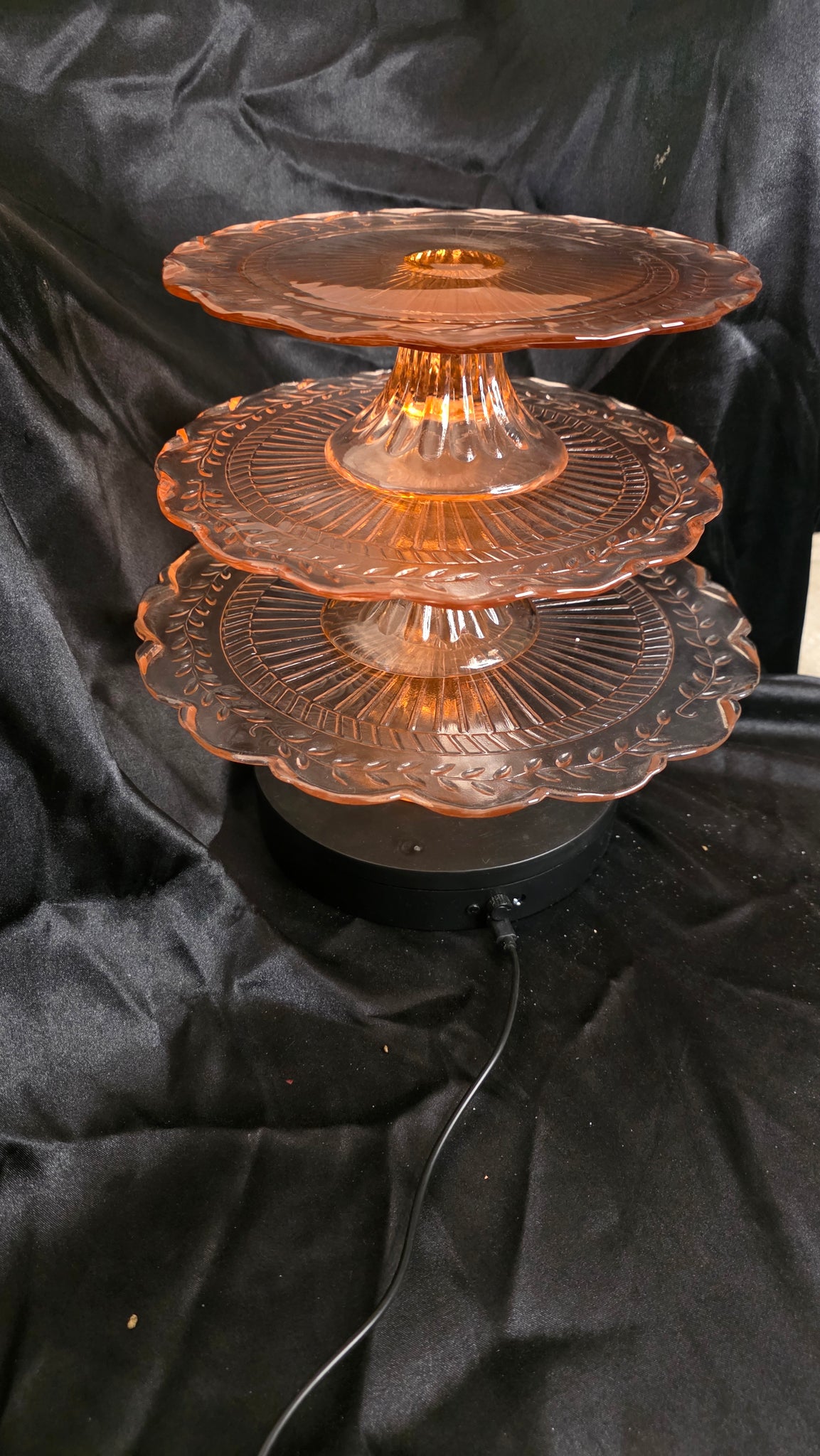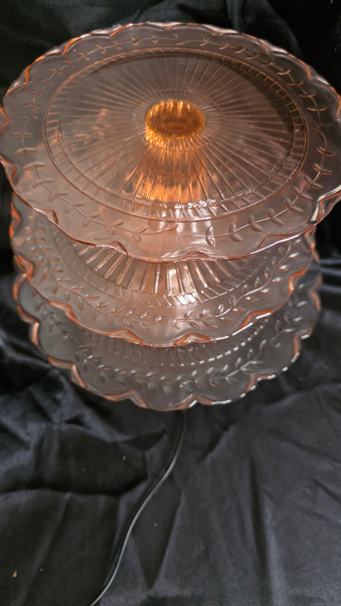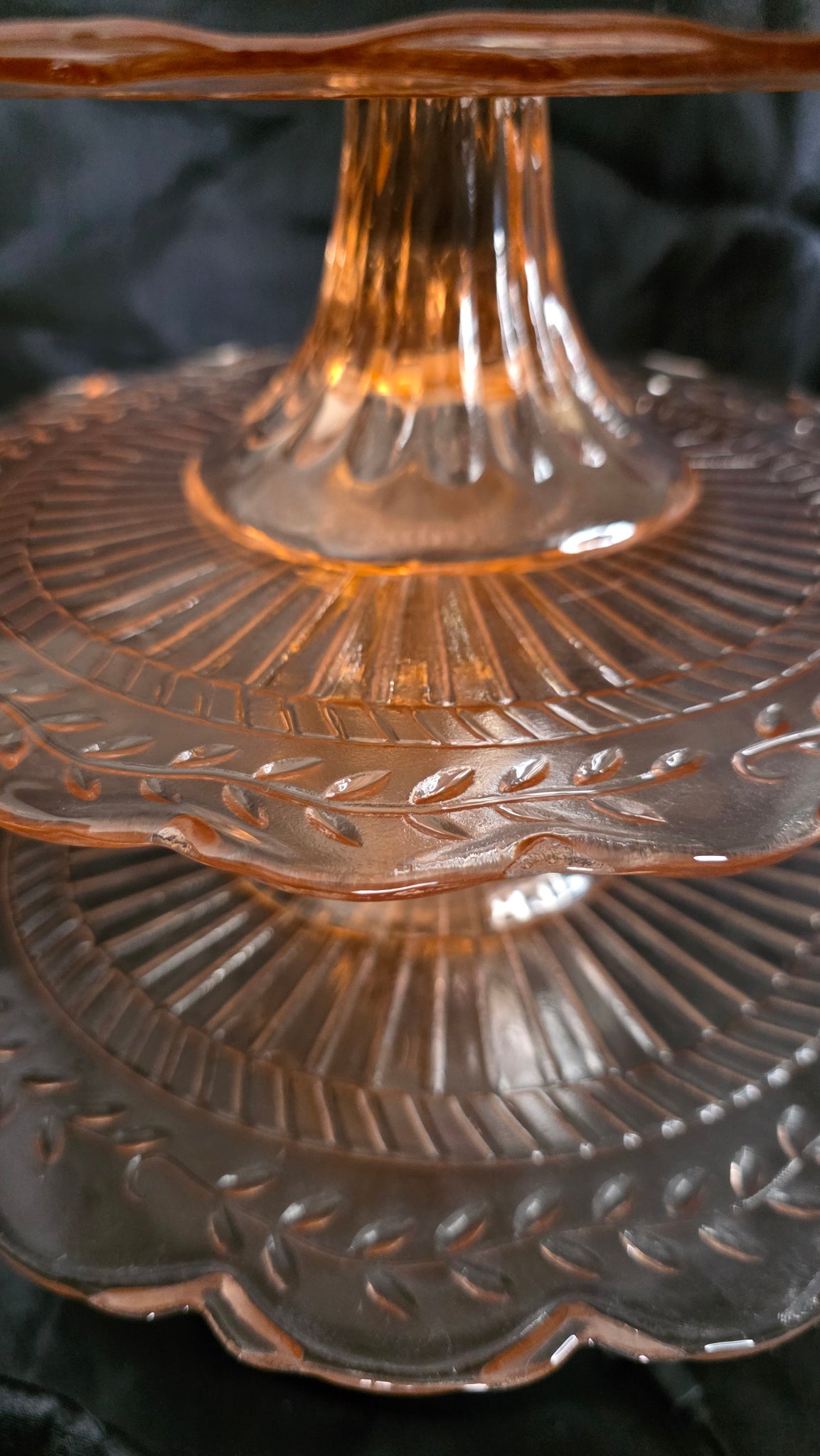 Graceful, luminous, and steeped in the romantic nostalgia of early 20th-century American glassmaking, this exquisite pink Depression glass three-tier pedestal server rises like a tower of soft, radiant light. Each tier reveals the unmistakable charm of pressed glass craftsmanship: sunburst radiance at the center, fluted lines that shimmer outward, and a scalloped edge adorned with delicate laurel leaf etching that traces its way around the rim like a garland of celebration. Individually beautiful and collectively breathtaking, all three tiers nest in an elegant vertical arrangement, creating a display piece that feels both architectural and ethereal.