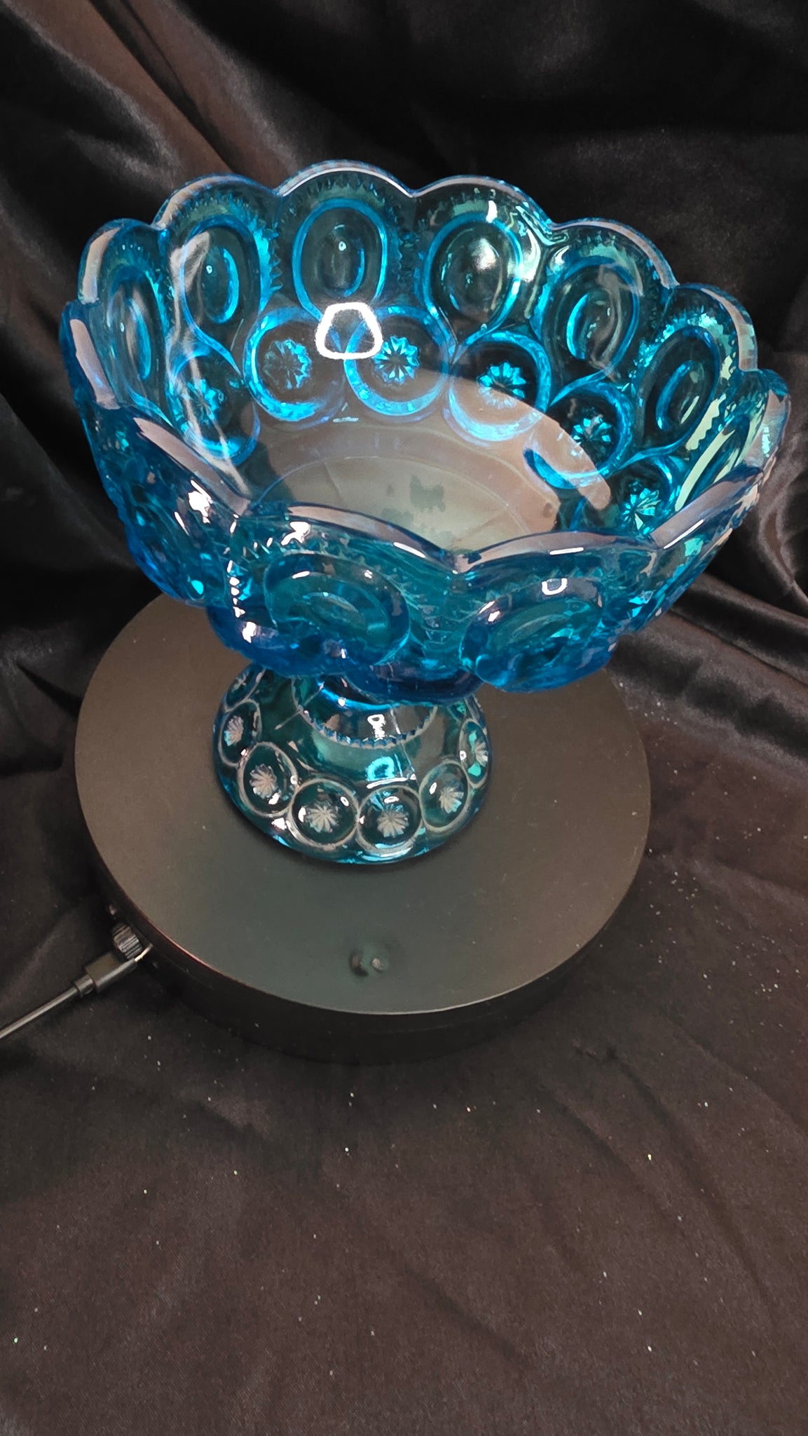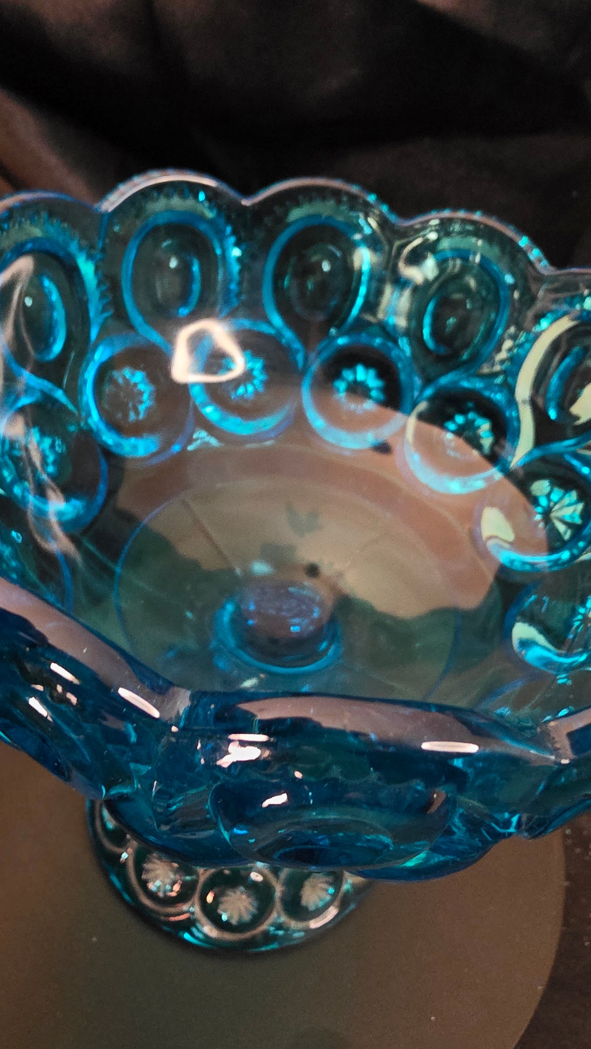 Beneath a veil of twilight azure, where the sea's secrets meet the artisan's touch, a glass compote rises like a jewel from forgotten depths—its bowl a cascade of scalloped waves, embossed with the whisper of a bygone year, encircled by patterns that evoke the rhythm of ocean swells. The stem, sturdy yet graceful, supports this radiant vessel, its base adorned with etched starbursts that catch light like distant constellations, all rendered in a mesmerizing turquoise hue that shifts with the play of shadows, evoking the tranquility of coastal horizons.
