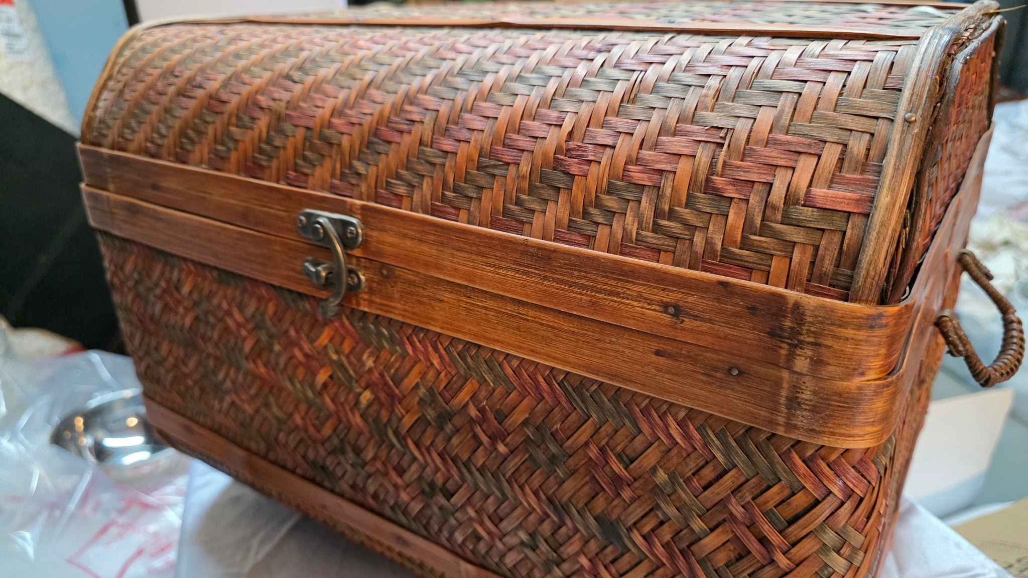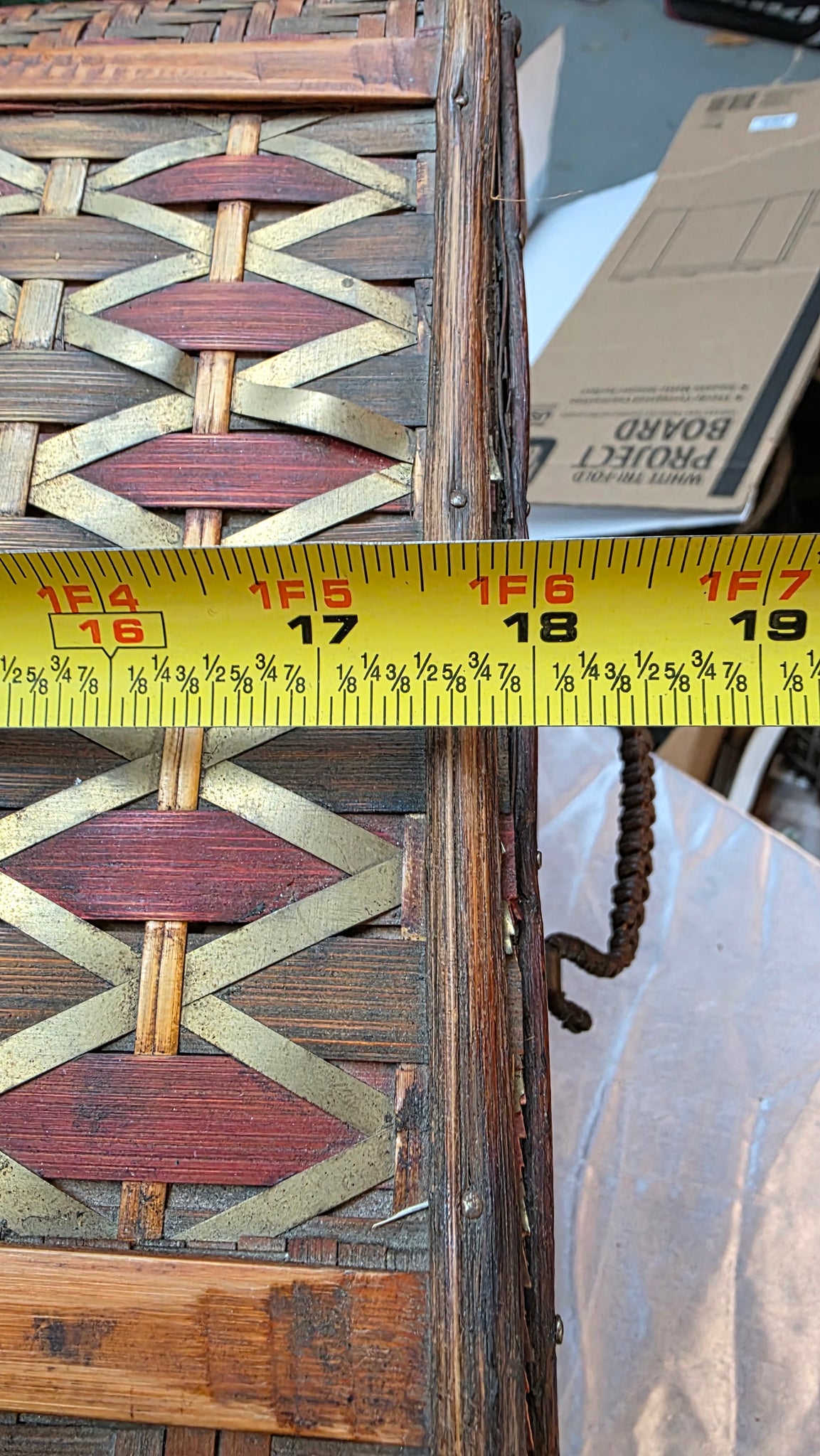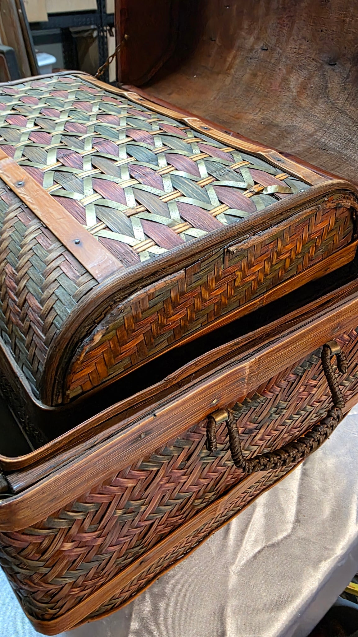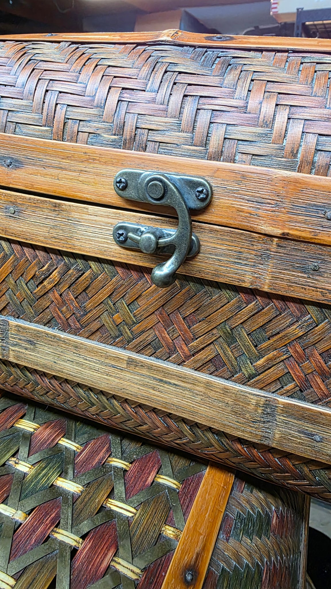 This three-piece vintage woven bamboo trunk set presents a beautifully coordinated display of traditional craftsmanship and timeless design. Each chest is formed with a domed, hinged lid and a tightly woven geometric pattern that creates depth, texture, and visual rhythm across the surface. The natural variation in the bamboo tones gives the set a warm, organic presence that feels both collected and intentional.