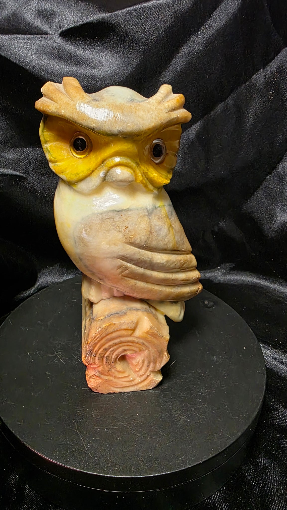 The owl’s expression is captivating. Inset glass eyes catch the light with a subtle glimmer, giving the sculpture a sense of awareness and character that feels almost alive. Carefully carved feather details wrap around the body, while the owl perches atop a stylized log base, grounding the piece with balance and visual weight. Every curve and contour reflects the skilled hands of Italian artisans who specialized in alabaster carving during the mid-20th century.