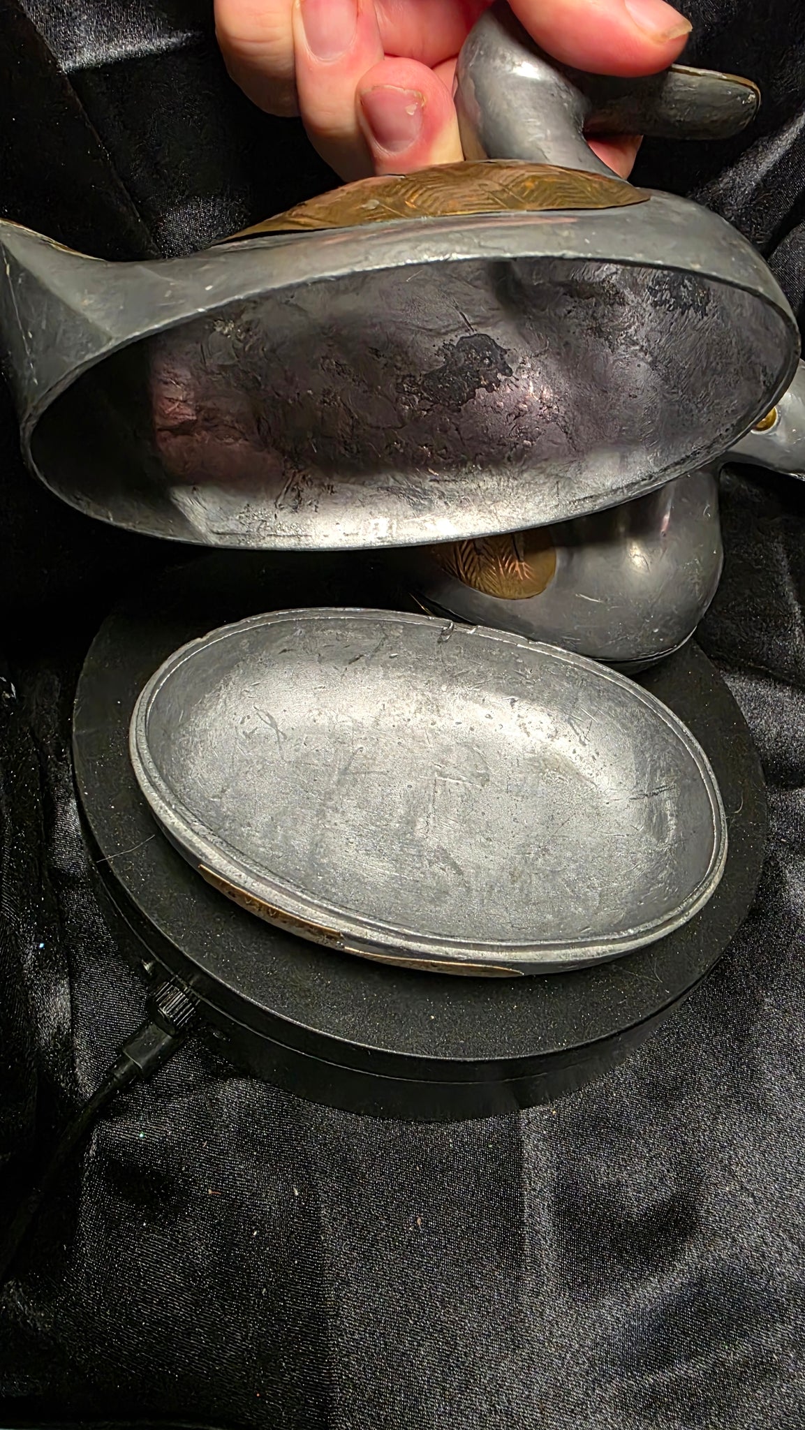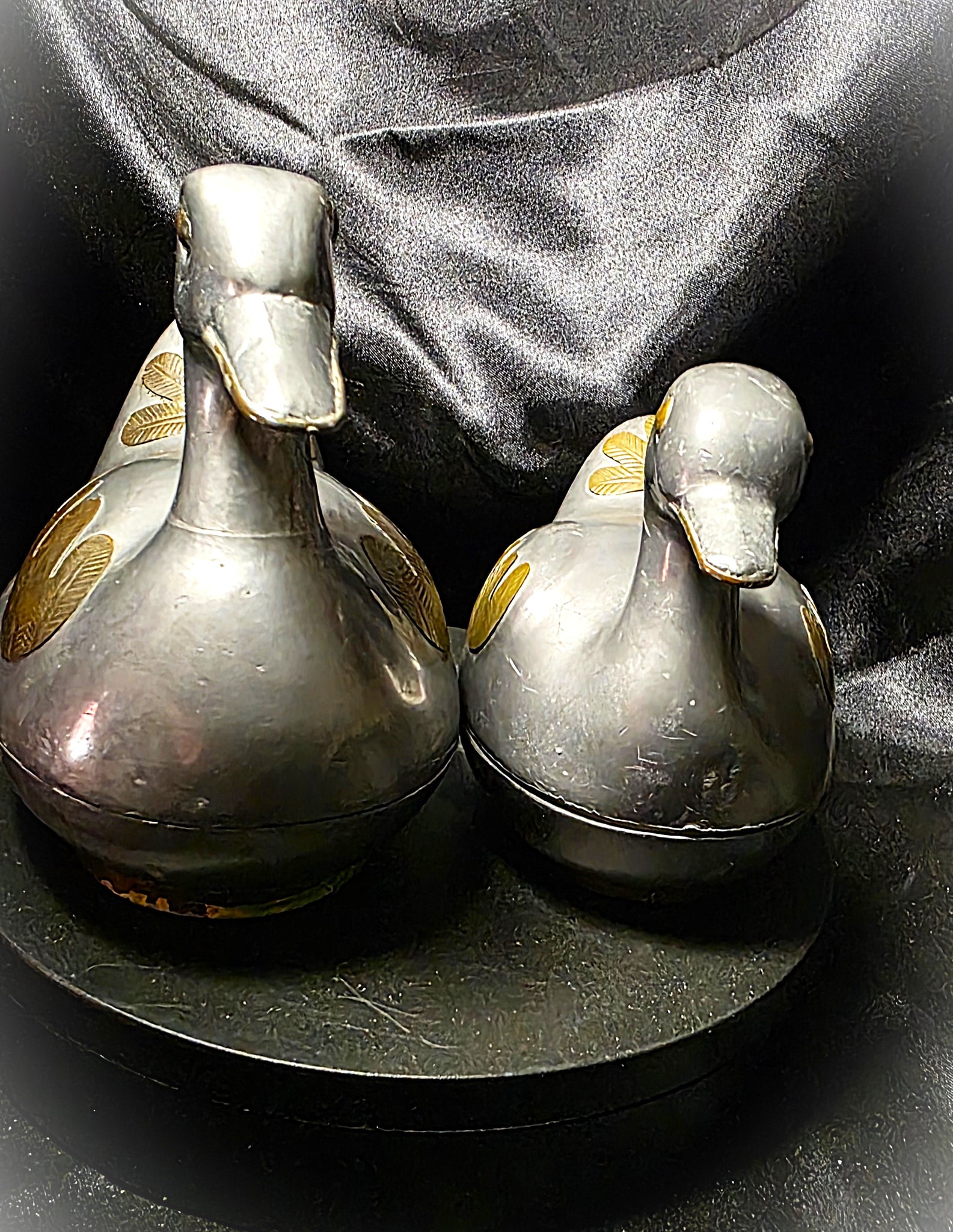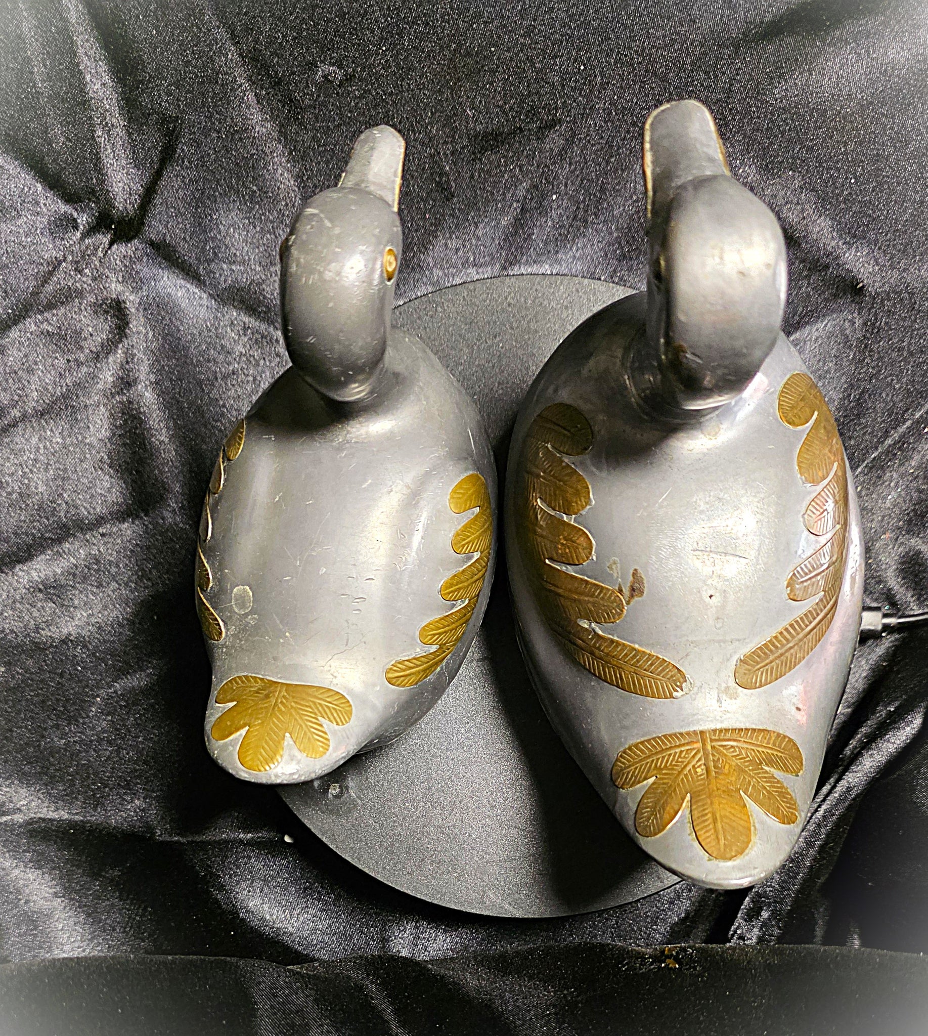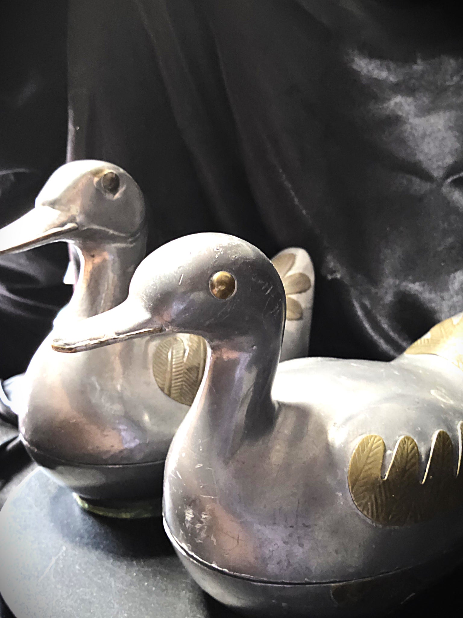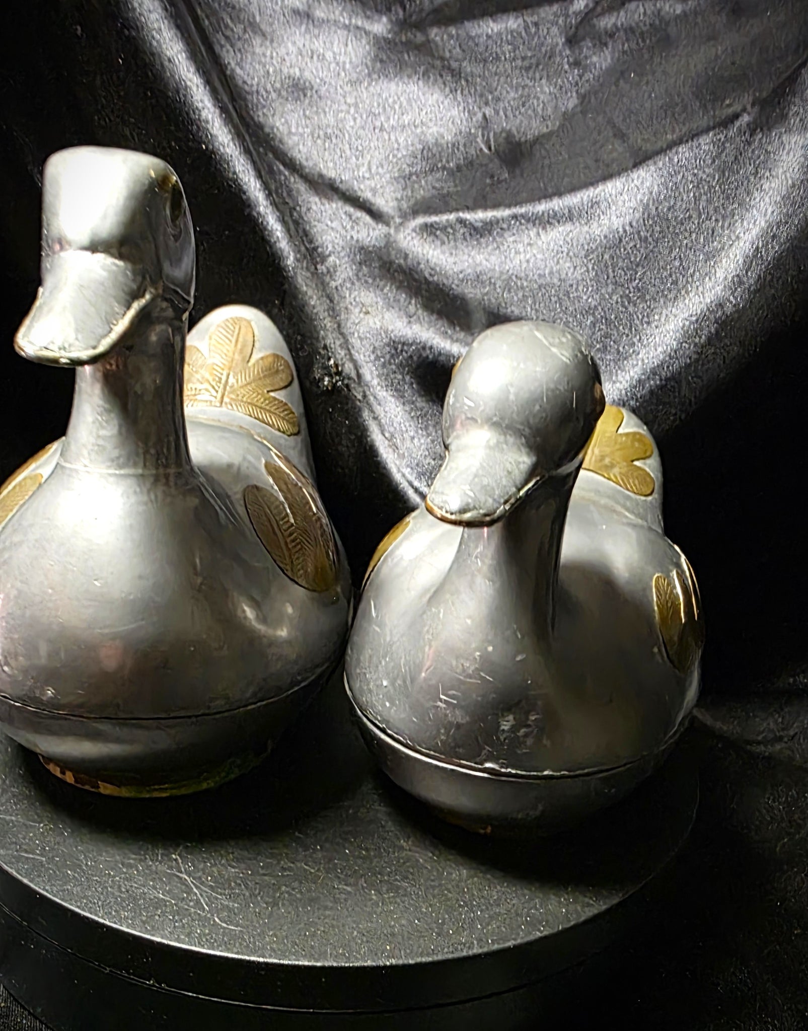 Cast in smooth pewter with warm brass accents, each duck features delicately detailed wings, tail feathers, eyes, and beak that catch the light subtly as you move around them. The form is rounded and tactile, inviting the hand, while the hinged construction allows the top half of each duck to lift open, revealing a hidden interior space once intended for rings, coins, or keepsakes that mattered enough to be tucked away.
