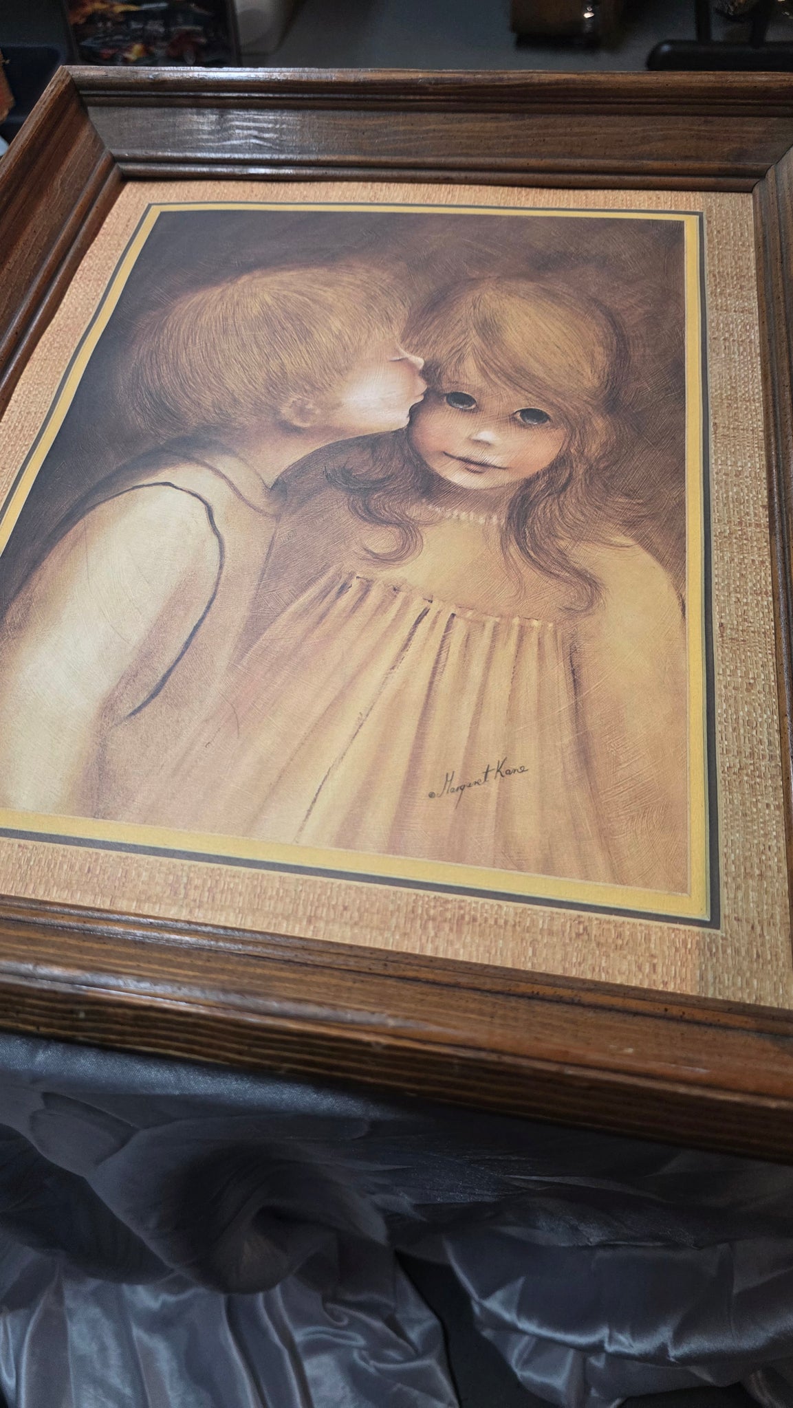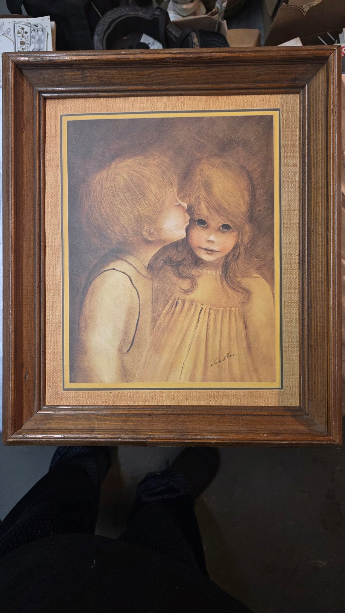 An iconic expression of mid-century sentimentality, this vintage print titled “A Little Kiss” by Margaret Kane captures a tender childhood moment rendered in the beloved Big Eye style of the 1960s and 1970s. A young boy leans in to kiss a girl’s cheek, her oversized, expressive eyes gazing softly outward—an image that embodies innocence, nostalgia, and the gentle romance that defined an era of popular decorative art. Warm sepia, honey, and golden tones create a soothing, cohesive palette that feels both intimate and timeless.