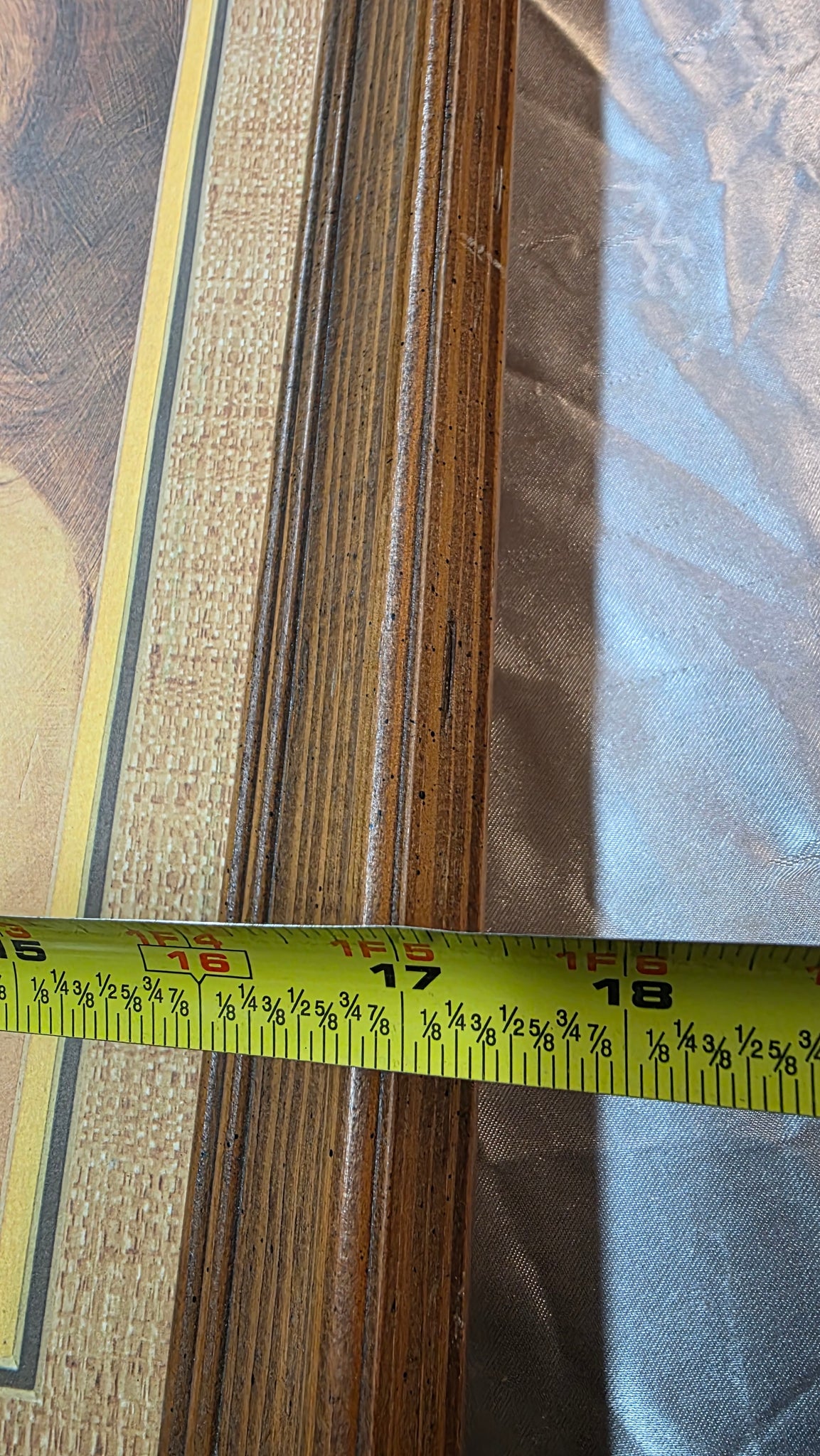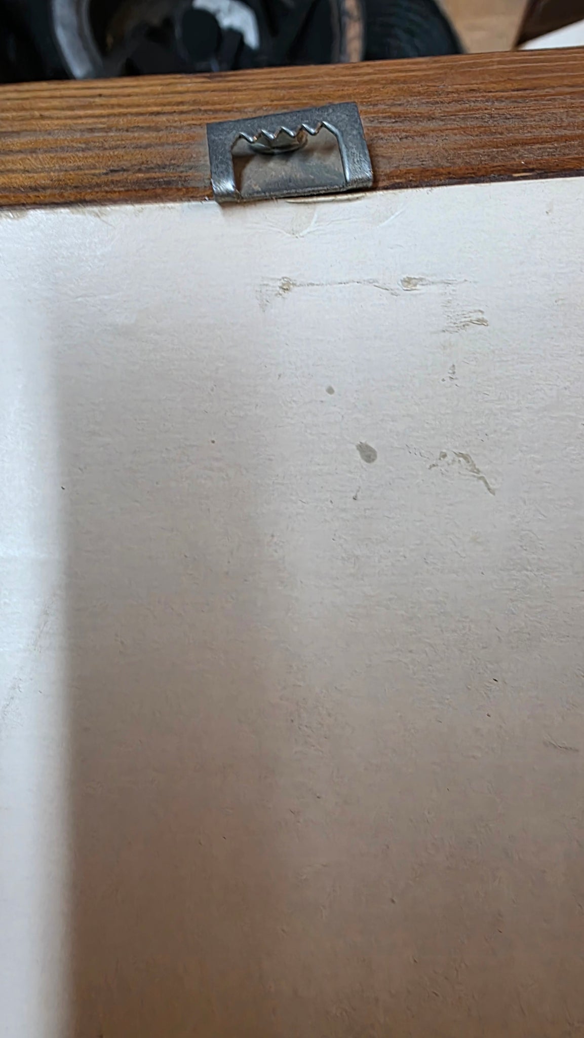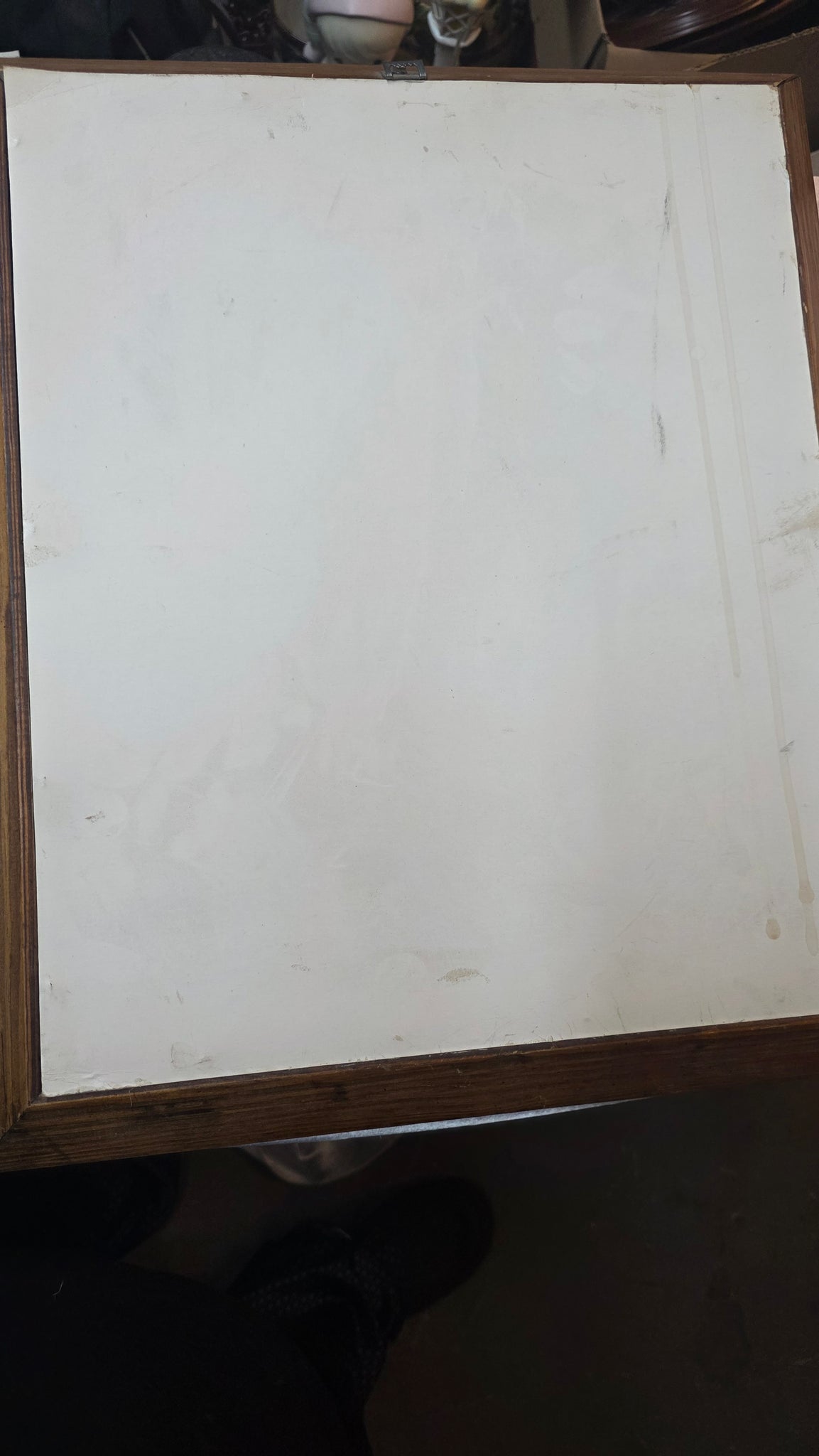 Housed in its substantial vintage wood frame with layered molding detail and a burlap-style textured border, the presentation is quintessentially mid-century. The rich wood tones complement the artwork’s earthy palette, making it a ready-to-display statement for collectors of MCM décor, retro interiors, or nostalgic children’s art. A complete period piece that captures both artistic trend and emotional warmth in one cohesive presentation.