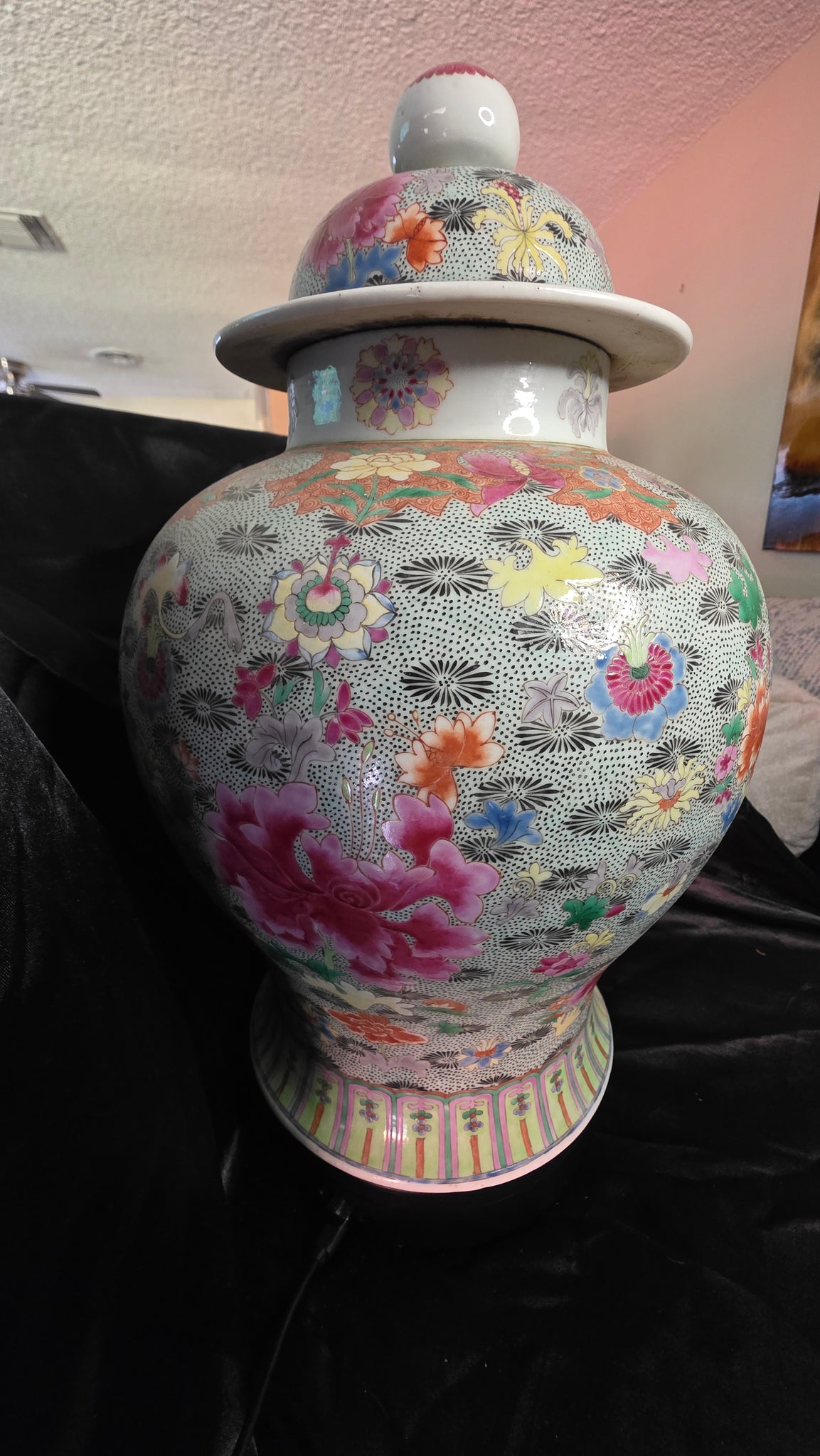 The jar’s generous proportions and graceful silhouette create a commanding centerpiece, while the sweeping shoulder and crisp foot ring lend balance and poise. A finial-topped cover completes the profile; together they read as sculpture from every angle. Up close, you’ll notice confident brushwork, fine linework around the petals, and the rhythmic “starburst” florets that punctuate the dotted field—details that reward long looks and good light. There is a small rim nick on the lid (see photos), mentioned for accuracy and reflected in the price; it does little to diminish the jar’s visual impact.