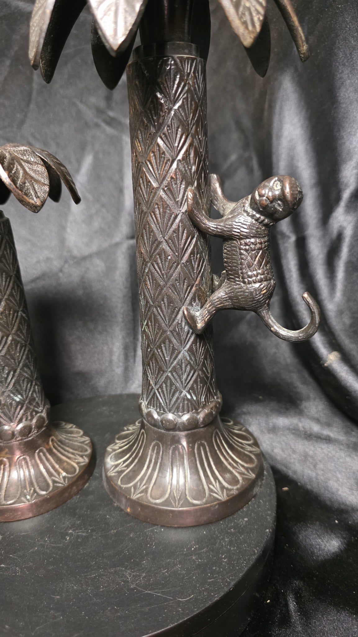 Their richly toned metallic finish carries depth and character, with sculptural detailing throughout the trunks, bases, and foliage. The weight in hand speaks to their substantial construction, grounding the whimsical subject matter in a sense of permanence and quality. Each element — from the layered palm leaves to the expressive forms of the monkeys — is crisply rendered, giving the set architectural strength as well as decorative charm.