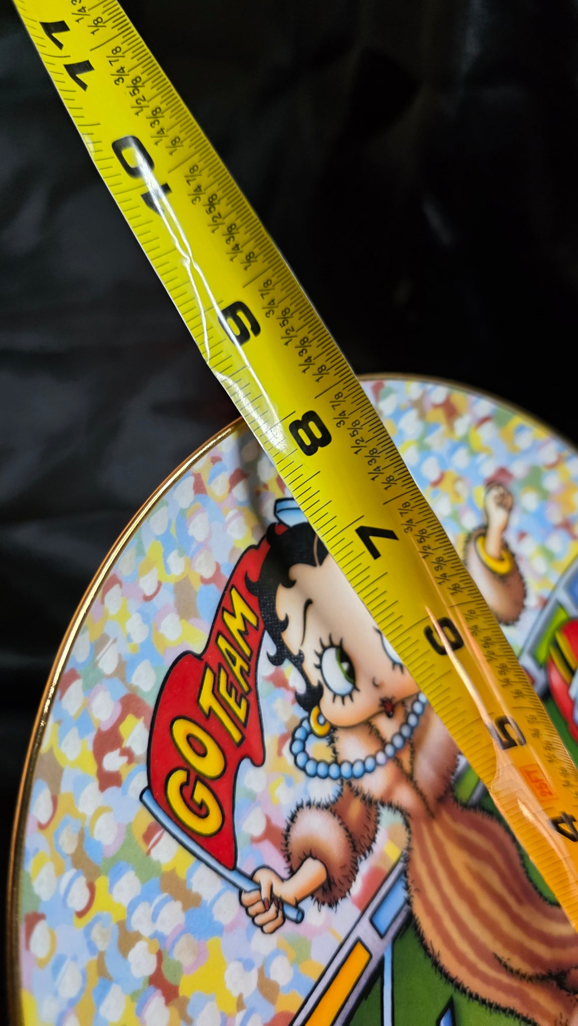 A vibrant burst of nostalgia and classic American charm, this limited-edition 1994 Danbury Mint collector plate brings Betty Boop to life in a scene filled with color, character, and undeniable mid-century magic. Titled “Homecoming Queen,” this officially licensed piece from the Betty Boop – America’s Sweetheart series captures the iconic starlet mid-stride at a lively football homecoming celebration, waving her spirited “Go Team!” banner while Pudgy, her loyal companion, stands by in his pint-size helmet, adding a perfect touch of whimsy.