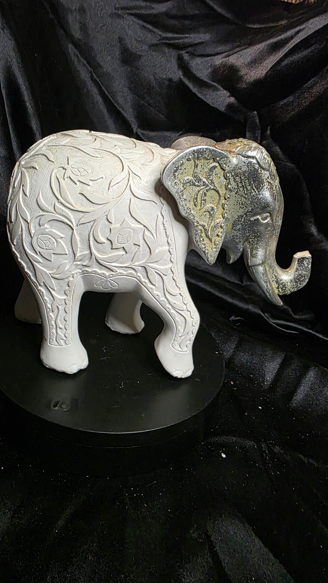 In the hushed glow of an ancient atelier, where clay whispers secrets of far-off lands, this petite ceramic elephant emerges like a guardian from misty memories, its trunk curled upward in a timeless symbol of good fortune. Its creamy white body is adorned with intricate floral engravings—delicate leaves and blossoms etched in relief, accented by subtle silver and gold tones that catch the light like hidden jewels. Crafted in China, as marked by its golden sticker, this piece echoes the artistry of mid-20th-century imports, where simple forms met elaborate patterns to evoke exotic elegance without a single etched mark out of place.