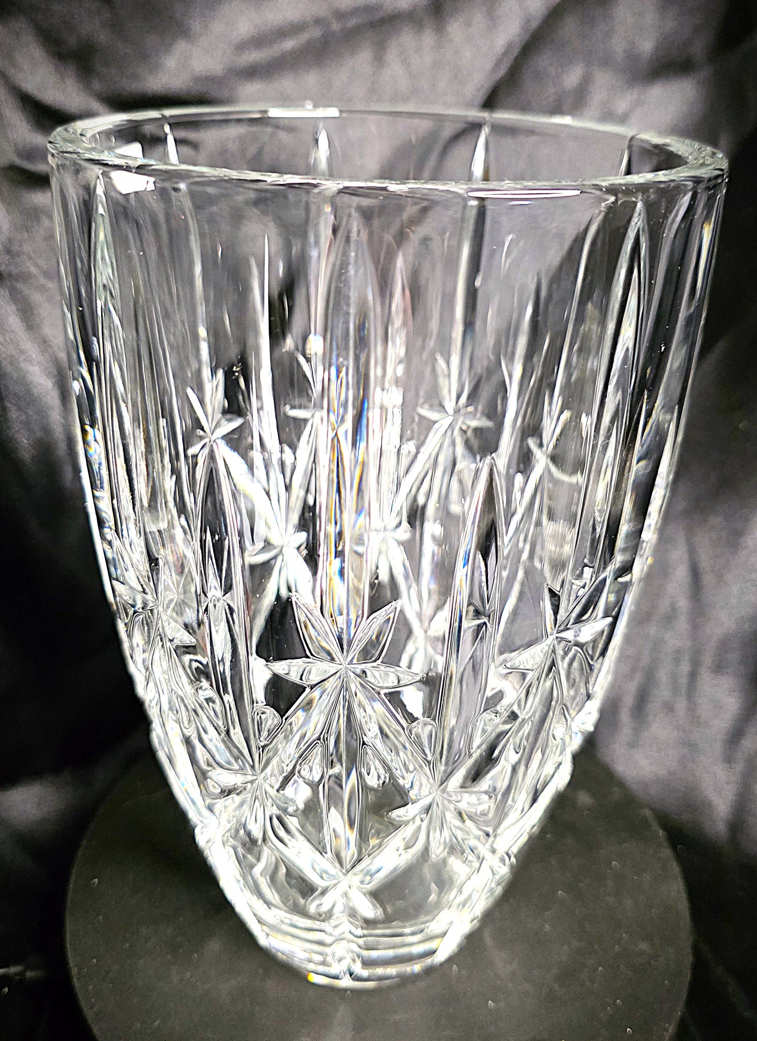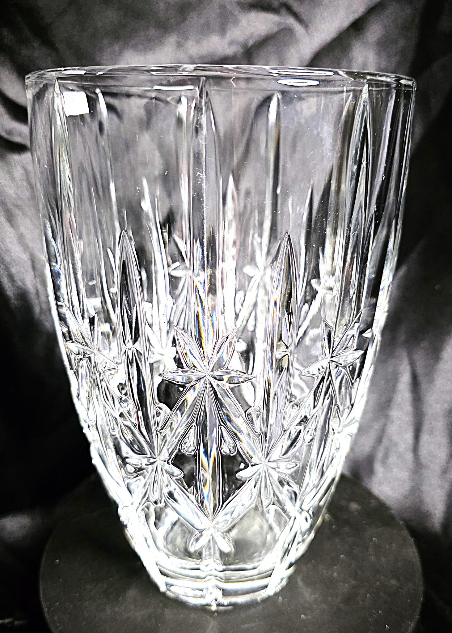 A true celebration of light, craftsmanship, and refined European artistry, this Marquis by Waterford crystal vase captures the eye with its tall vertical cuts, radiant starburst medallions, and the unmistakable brilliance that has made Waterford a household name among collectors for generations. Standing at approximately 9.5 inches tall, the vase carries a sculptural, architectural presence—its faceted panels refract light into a dance of fire and clarity, while the star-form motifs add dimension, depth, and unmistakable elegance.