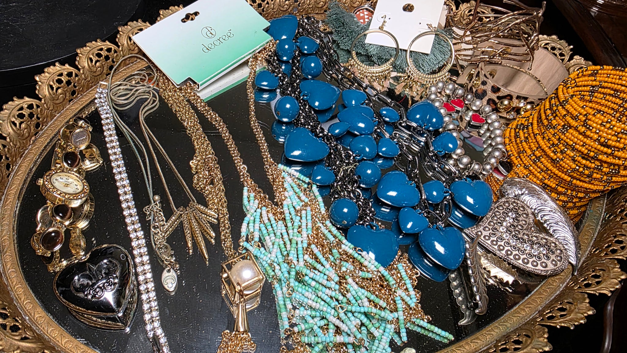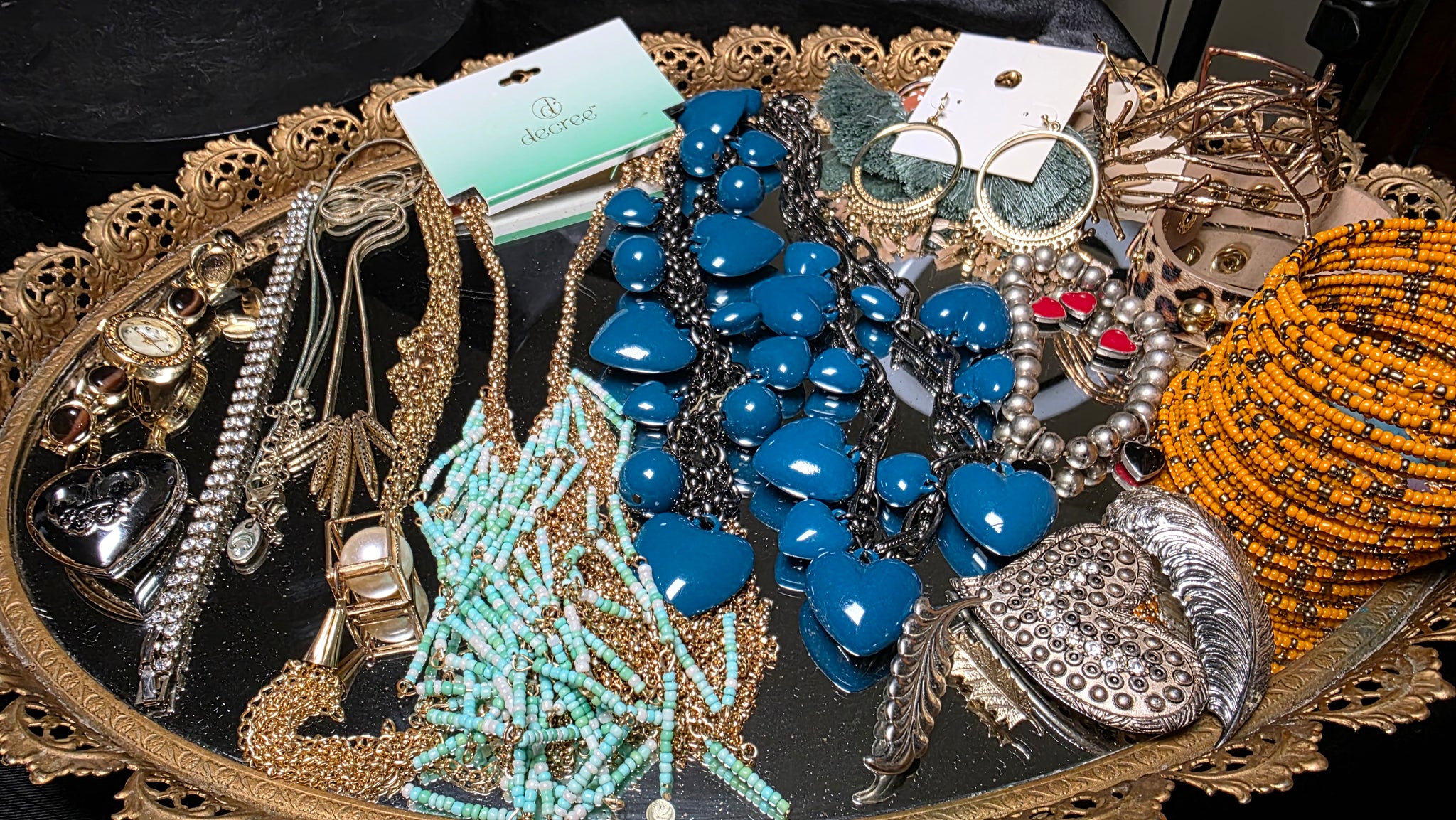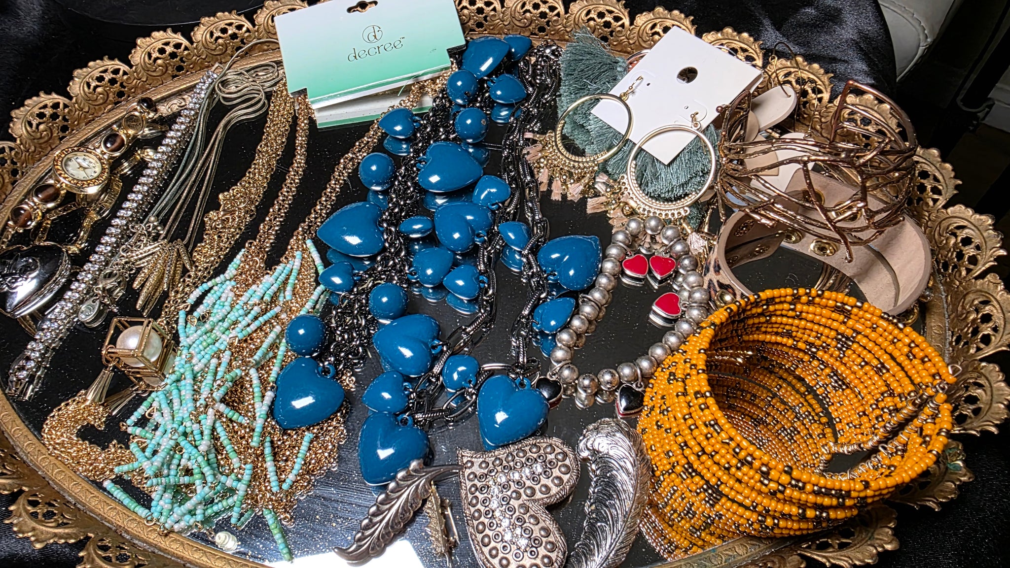 Notable pieces visible in the collection include a bold teal blue bib-style necklace featuring multiple heart-shaped dangles on a dark-toned chain, layered bead necklaces with turquoise-tone seed beads and gold-tone accents, a wide orange and black beaded wrap-style bracelet, a sculptural wire cuff bracelet, hoop-style earrings with fringe detail, red heart-shaped earrings, a silver-tone heart pendant or locket-style piece, and a gold-tone fashion wristwatch. A “Decree” branded tag is also present among the items.