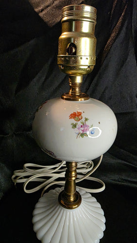Vintage Hand-Painted Floral Boudoir Lamp with Milk Glass Base & Brass Detail – 1930s Vanity Lighting Elegance