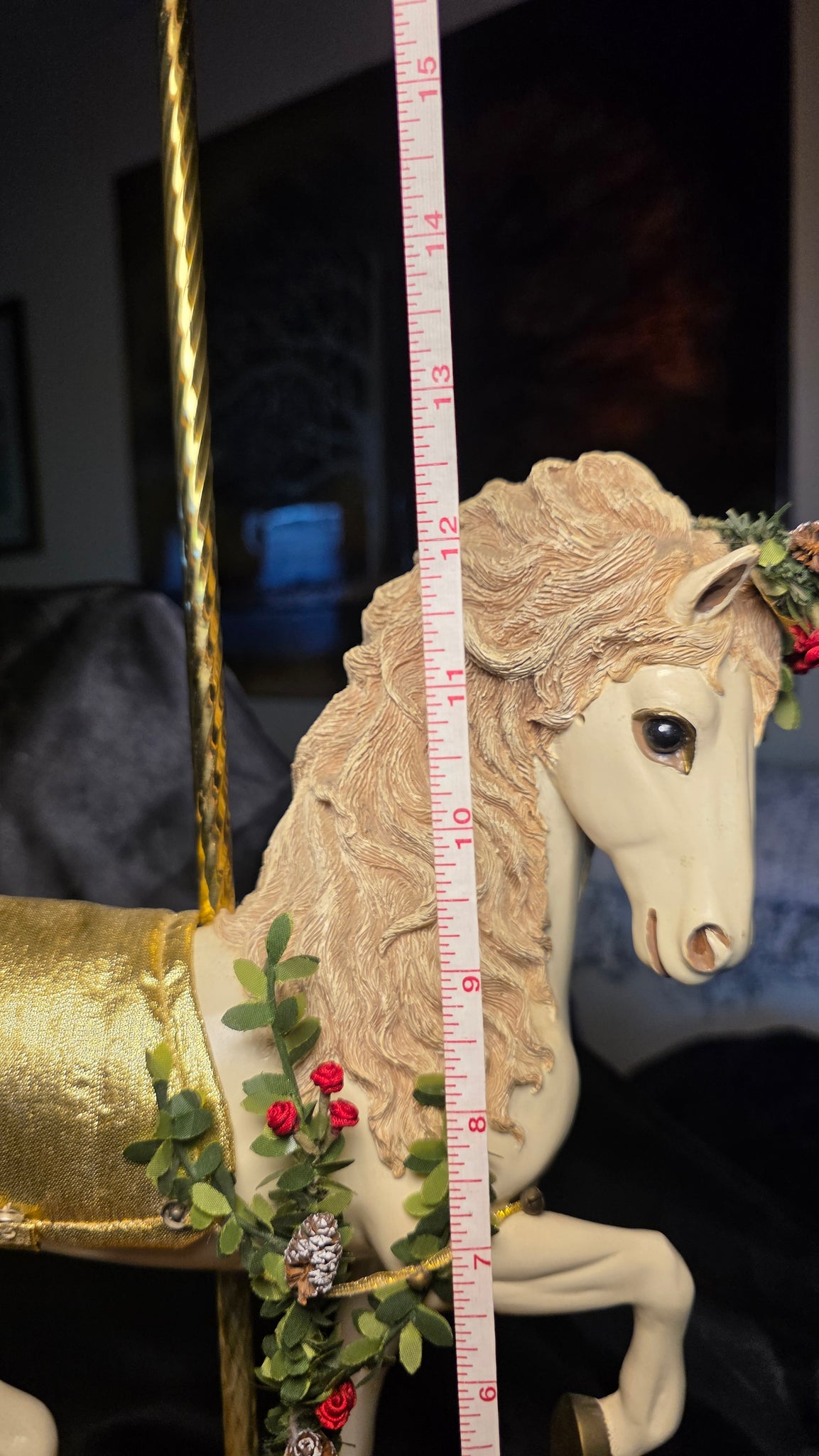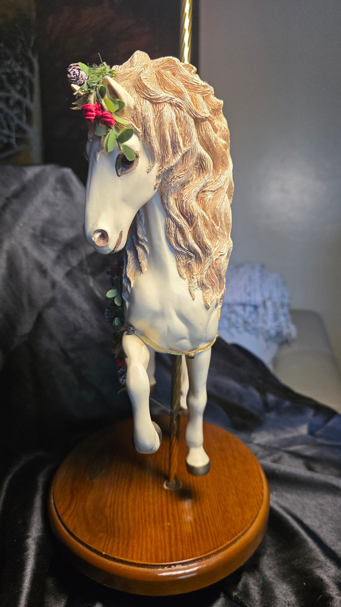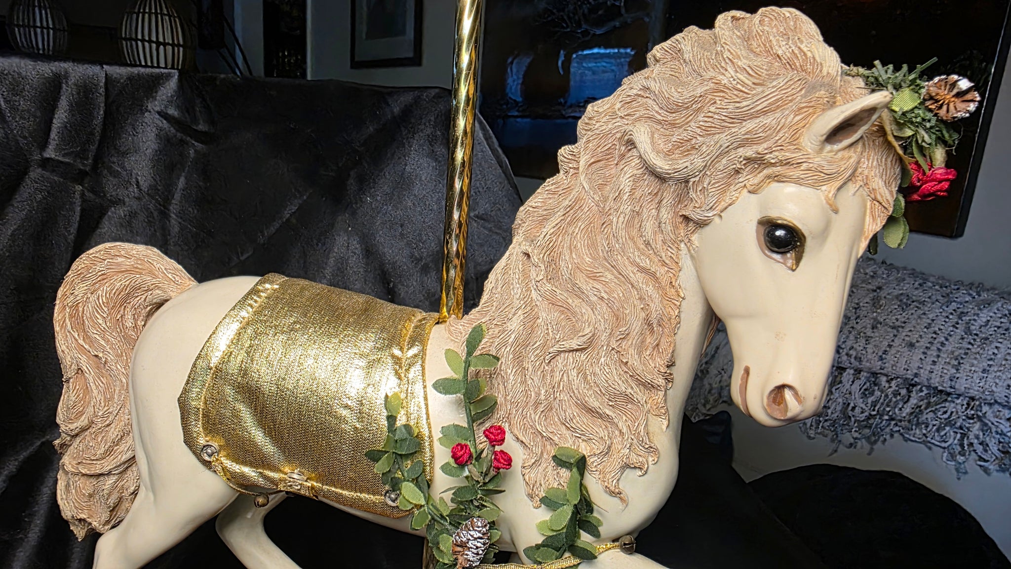 Mounted on a warm-toned wooden base with a classic brass pole, the piece carries the nostalgic charm of a traditional carousel while elevating it into a refined decorative statement. The gold-toned saddle cloth adds a subtle shimmer, complementing the organic seasonal accents and enhancing its presence as both a collectible and a display piece. Its composition feels both festive and sophisticated, bridging holiday warmth with year-round decorative appeal.