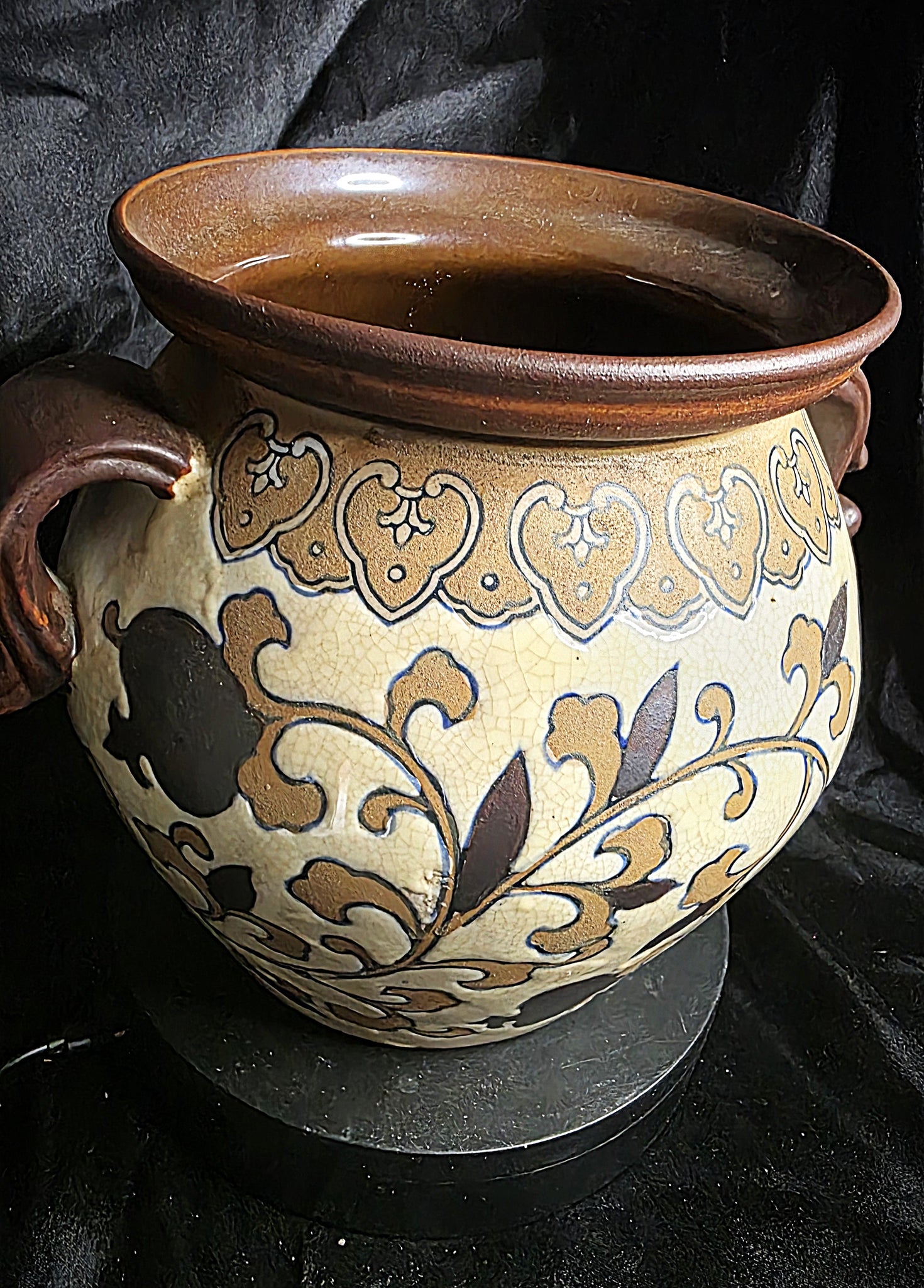 This beautifully hand-crafted ceramic vessel embodies the warmth, artistry, and refined earthiness that define old-world pottery traditions. Its richly toned rim and interior glow with a deep, rustic glaze, creating a striking contrast against the exterior’s intricate scrollwork motif. The cream-washed body features a network of aged crackling that lends an authentically timeworn appeal, while the sweeping botanical patterns, outlined in bold, dark strokes, wrap the form in a tapestry of movement and elegance.