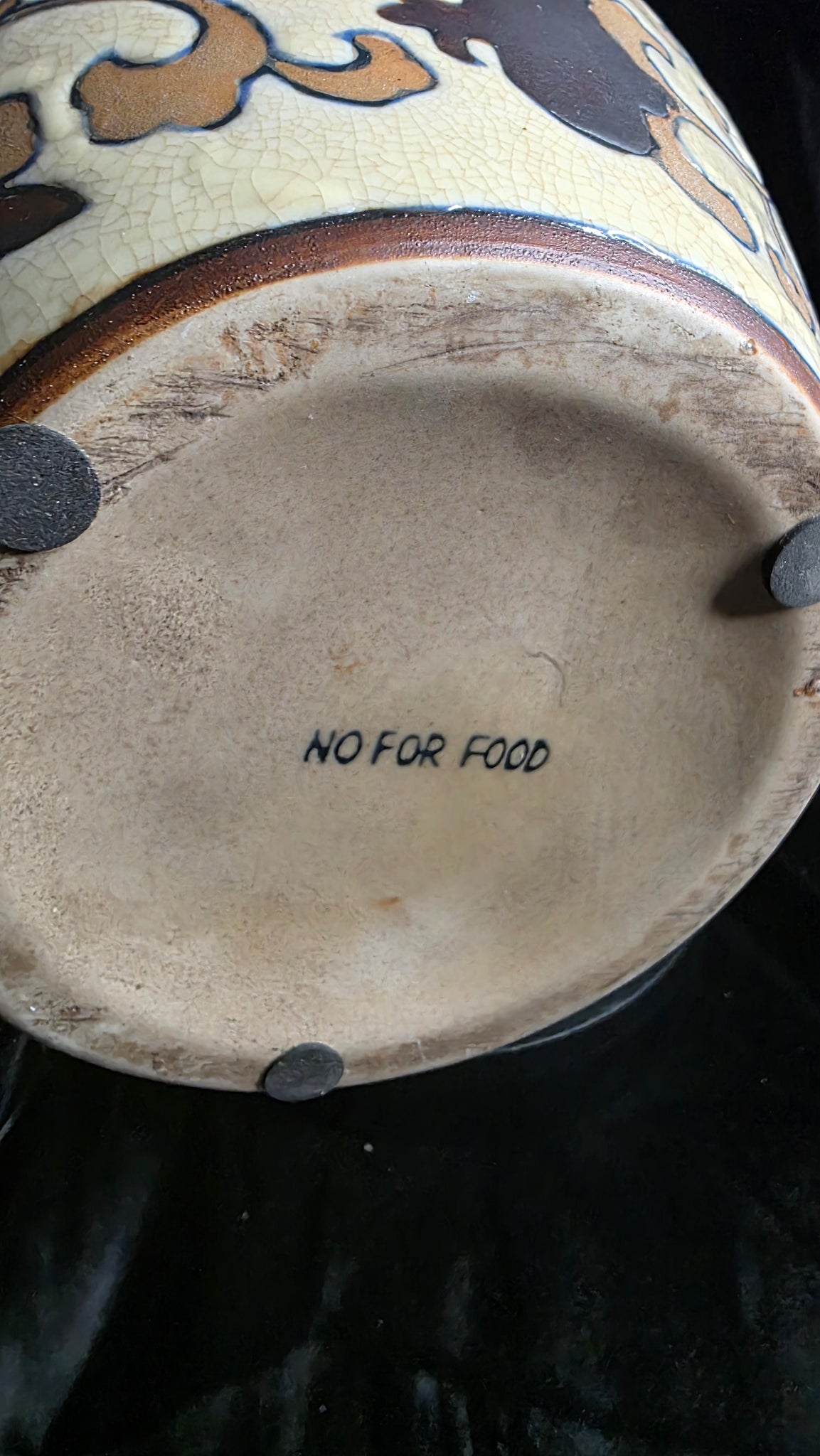 Curved side handles add sculptural presence and practical charm, enhancing the vessel’s decorative stature. The underside is marked as not intended for food use, reinforcing its purpose as an artistic display piece rather than a functional kitchen item. Whether showcased as a standalone statement, filled with dried foliage, or incorporated into a curated vignette of mixed textures and tones, this vessel brings an exceptional aura of craftsmanship and character to any interior setting.