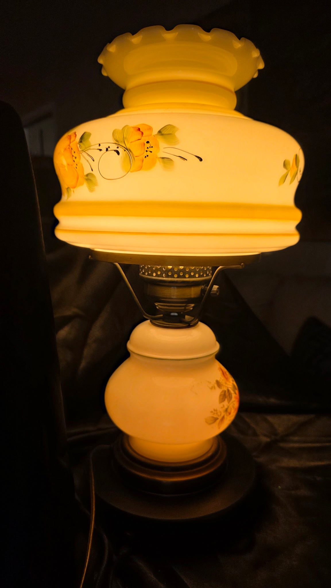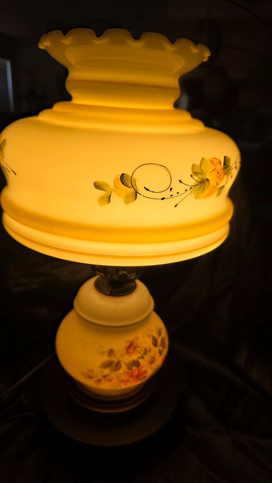 Crafted with hand-painted milk glass, the lamp features delicate yellow and orange florals that seem to float effortlessly across the softly glowing surface. When illuminated, the glass diffuses light into a warm amber hue, creating an inviting atmosphere reminiscent of quiet evenings, heirloom furniture, and rooms designed for lingering conversations.