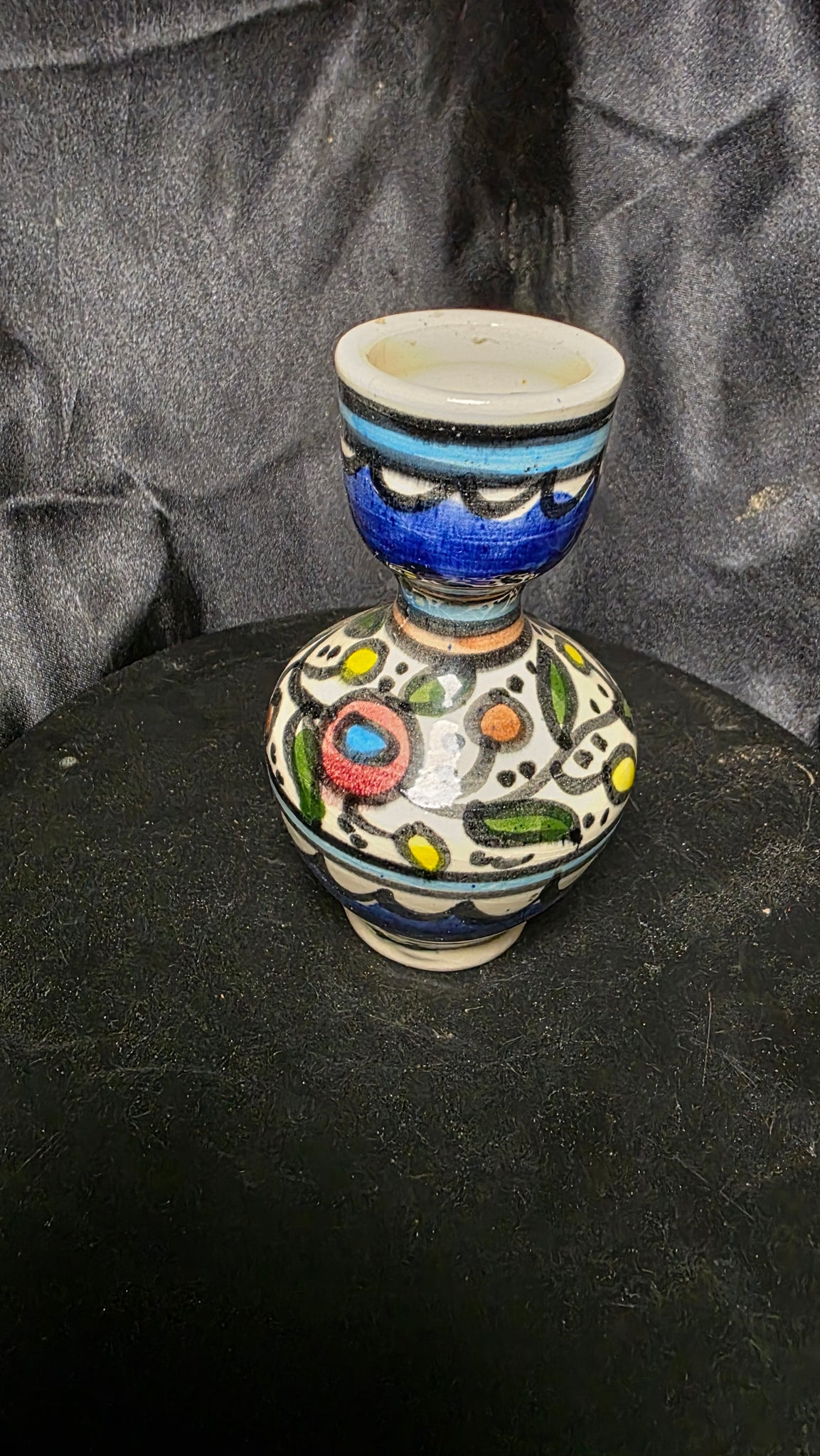 Designed as a decorative art pottery accent, this piece brings global character and curated sophistication to shelves, consoles, or tabletop displays. Its compact scale and striking coloration make it an ideal focal accent within eclectic, Mediterranean, or collected interiors.