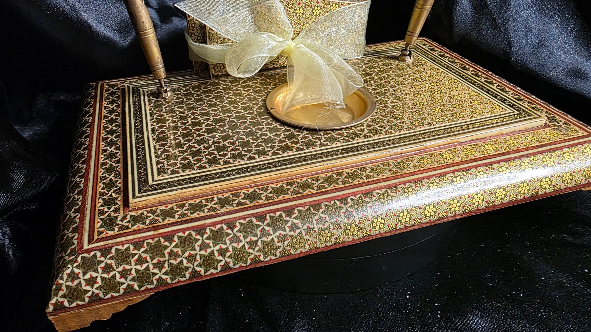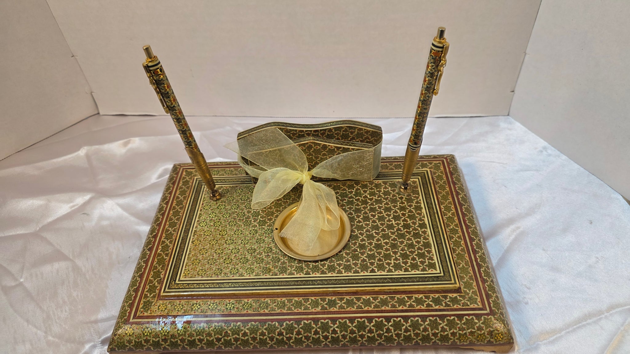 This remarkable desk set is a striking example of traditional Persian Khatamkari, an art form revered for its extraordinary precision and visual complexity. Thousands of minute pieces—carefully arranged into repeating geometric patterns—create a surface that feels both mathematically exact and organically beautiful. The effect is mesmerizing, drawing the eye inward with each layered detail.