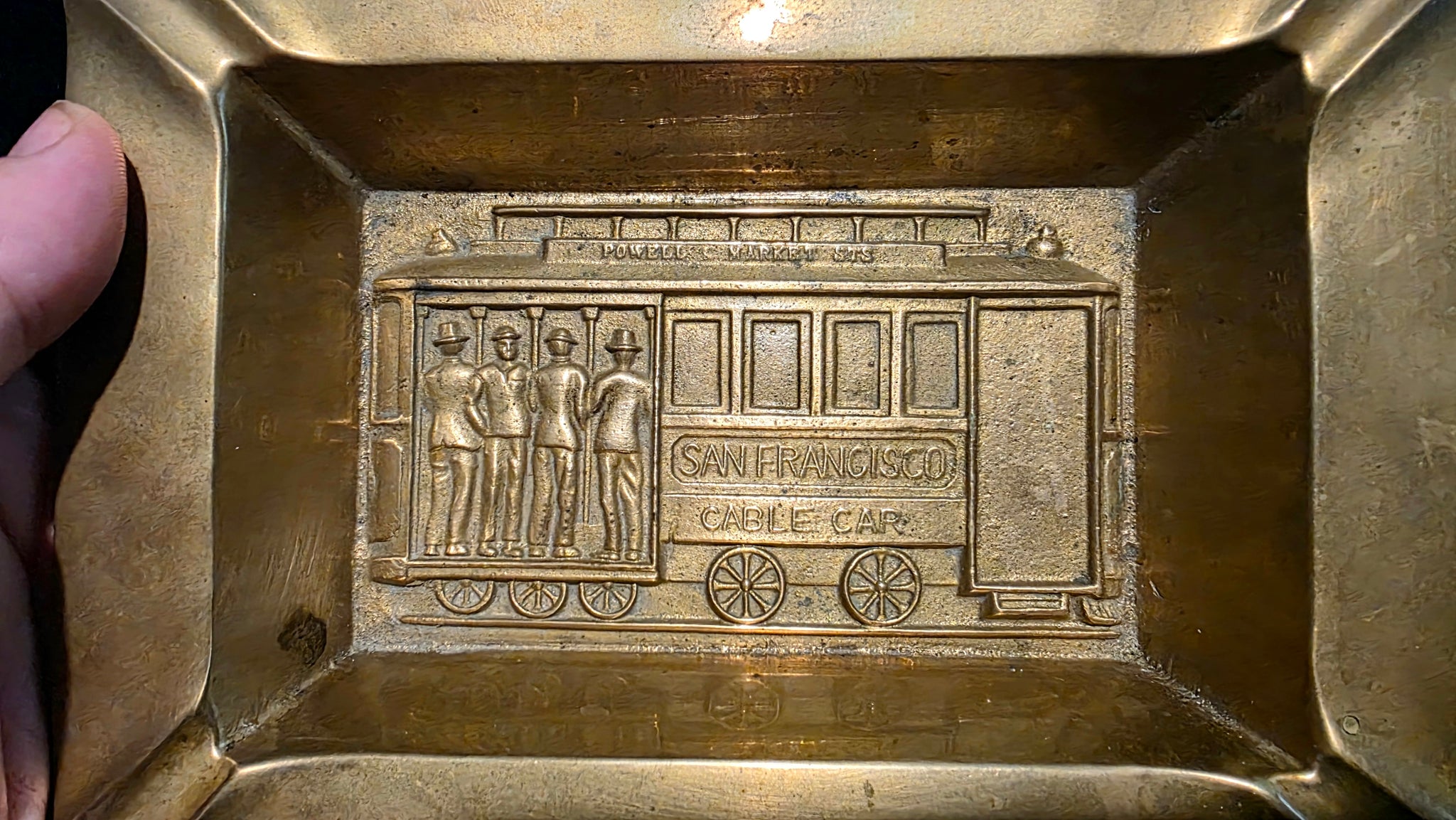 Step back into the golden age of travel with this striking vintage solid brass ashtray — a collectible homage to the heart of San Francisco. Crafted in India with remarkable attention to detail, this heavy, substantial piece features a beautifully embossed cable car scene, complete with passengers and the iconic Powell & Market St. route. The design captures the spirit of a city steeped in movement, innovation, and charm.