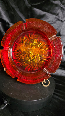 Vintage Mid-Century Amberina Art Glass Ashtray – L.E. Smith / Blenko Style, Swirling Sand Scroll Design, Red-to-Amber Glow, 1960s MCM Decor