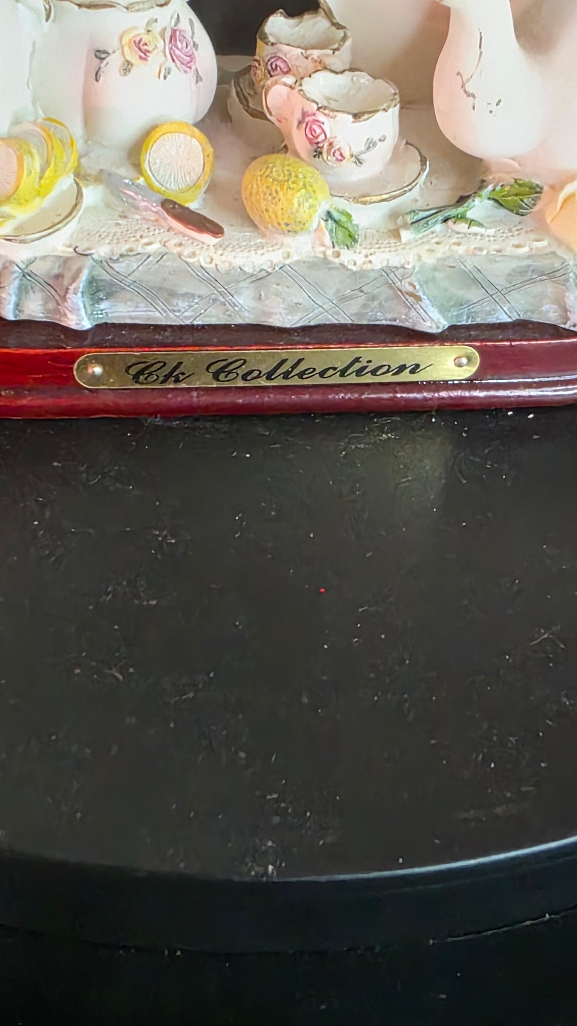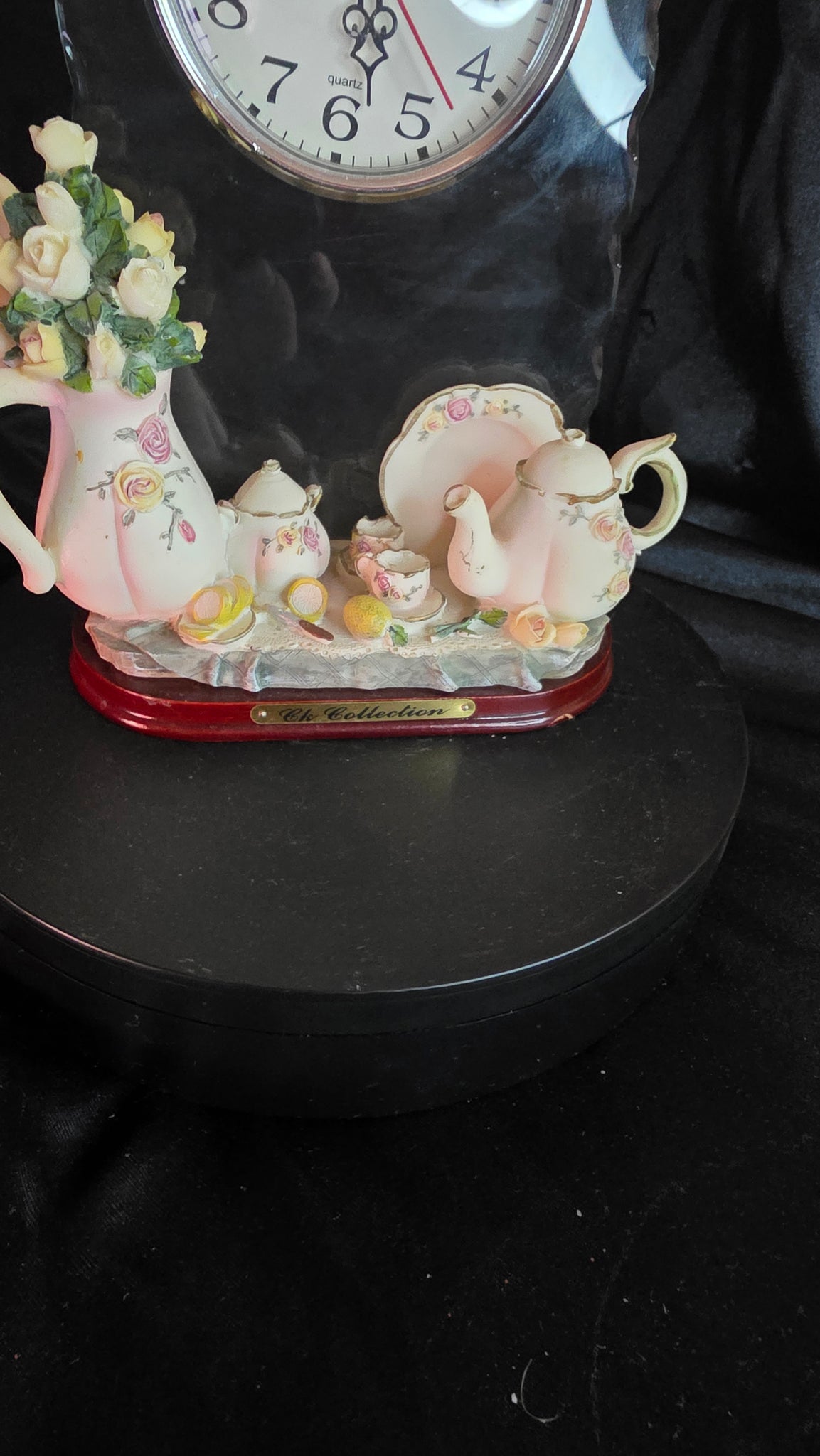 The artistry reads like a Victorian parlour moment captured in resin—subtle shading on every petal, gentle aging on the glaze, and lifelike cloth textures across the table setting—all protected by the glass backdrop that adds depth and reflection. Designed for a mantel, console, or kitchen sideboard, this decorative clock anchors a room with warmth and nostalgic elegance while remaining practical and easy to read at a glance. If you love cottagecore florals, tea-set collectibles, or refined shabby-chic décor, this one-of-a-kind display elevates your space with grace and quiet romance. Battery operated; ready to display on arrival.