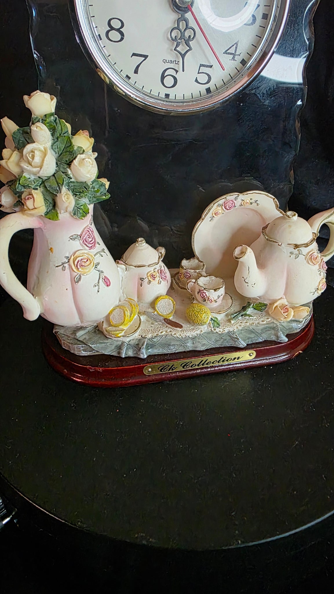 A charming marriage of timekeeping and tabletop poetry, this CK Collection quartz clock presents a hand-painted tea service arranged beneath a clear, sculpted glass panel. The vignette rests on a polished wood-tone plinth with an inset CK Collection nameplate, while the scene itself unfolds in soft blush and ivory: a bouquet pitcher brimming with pale roses, a teapot and covered sugar, petite cups and saucers edged in gilt, and bright lemon slices set on lace. The circular dial floats above the still life, framed in chrome with classic black numerals, ornate hands, and a smooth quartz sweep for dependable modern accuracy.