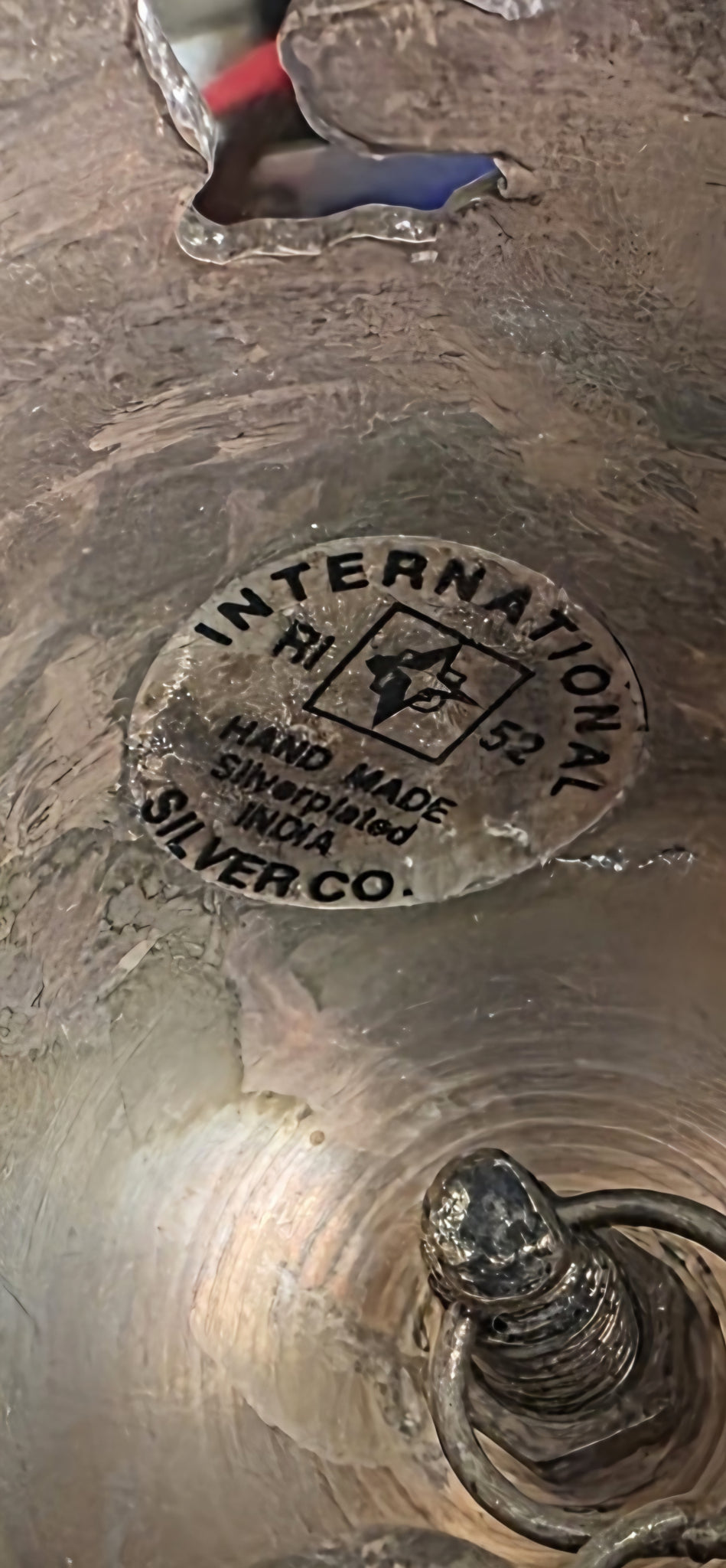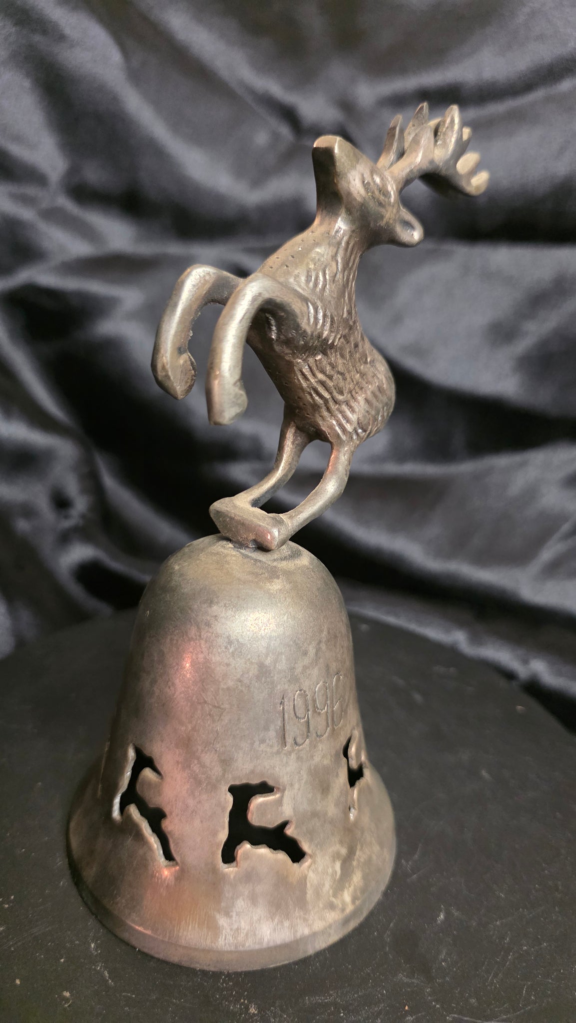 A beautiful blend of holiday charm and handcrafted silver artistry, this 1996 International Silver Co. Christmas bell is both a collectible keepsake and a timeless décor accent. Formed from silver-plated metal and marked Hand Made – India, the piece showcases a sculpted reindeer in mid-stride perched on top of the bell, its antlers raised high as though leaping into motion. Around the skirt of the bell, matching reindeer silhouettes are cut cleanly through the metal — an elegant detail that casts playful shapes when light passes through.
